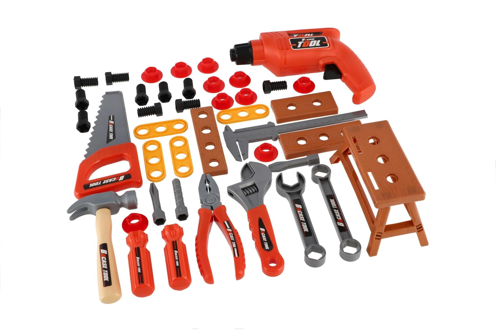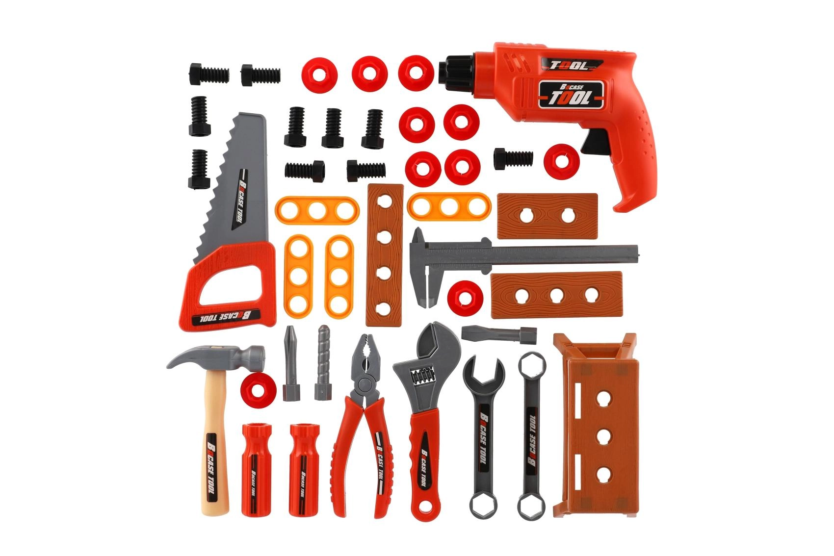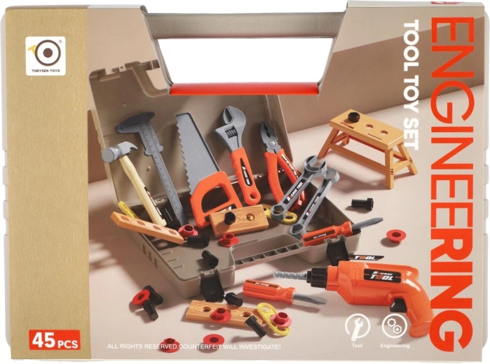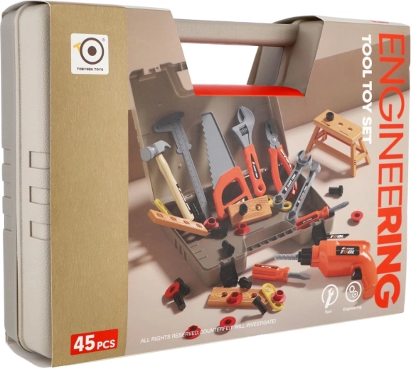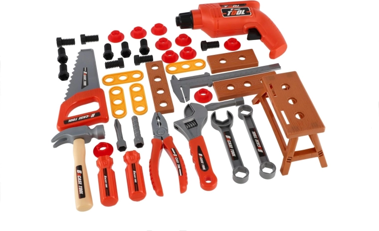 Ta popoln komplet orodja za otroke ponuja vse, kar mali mojster potrebuje za domiselno igro. V trpežnem kovčku boste našli številna plastična orodja, vključno z vrtalnikom na vztrajnik, ki deluje brez baterij – le navijte ga in varno se zavrti. Lahka zasnova, zaobljeni robovi in odporni materiali zagotavljajo igrivo in varno zabavo.