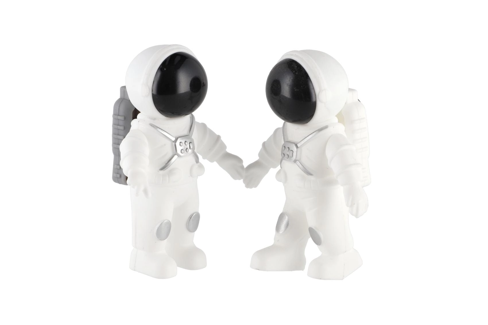 Podrobno izdelana astronavta z nahrbtniki in črnimi vizirji sta pripravljena na vesoljske odprave, popravila satelita in raziskovanje baze.