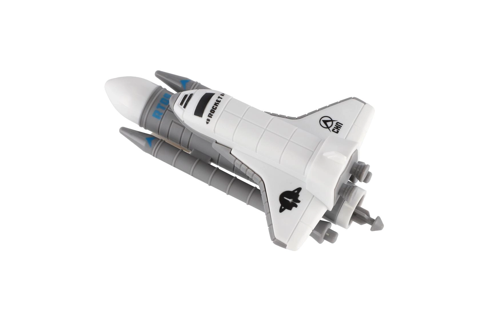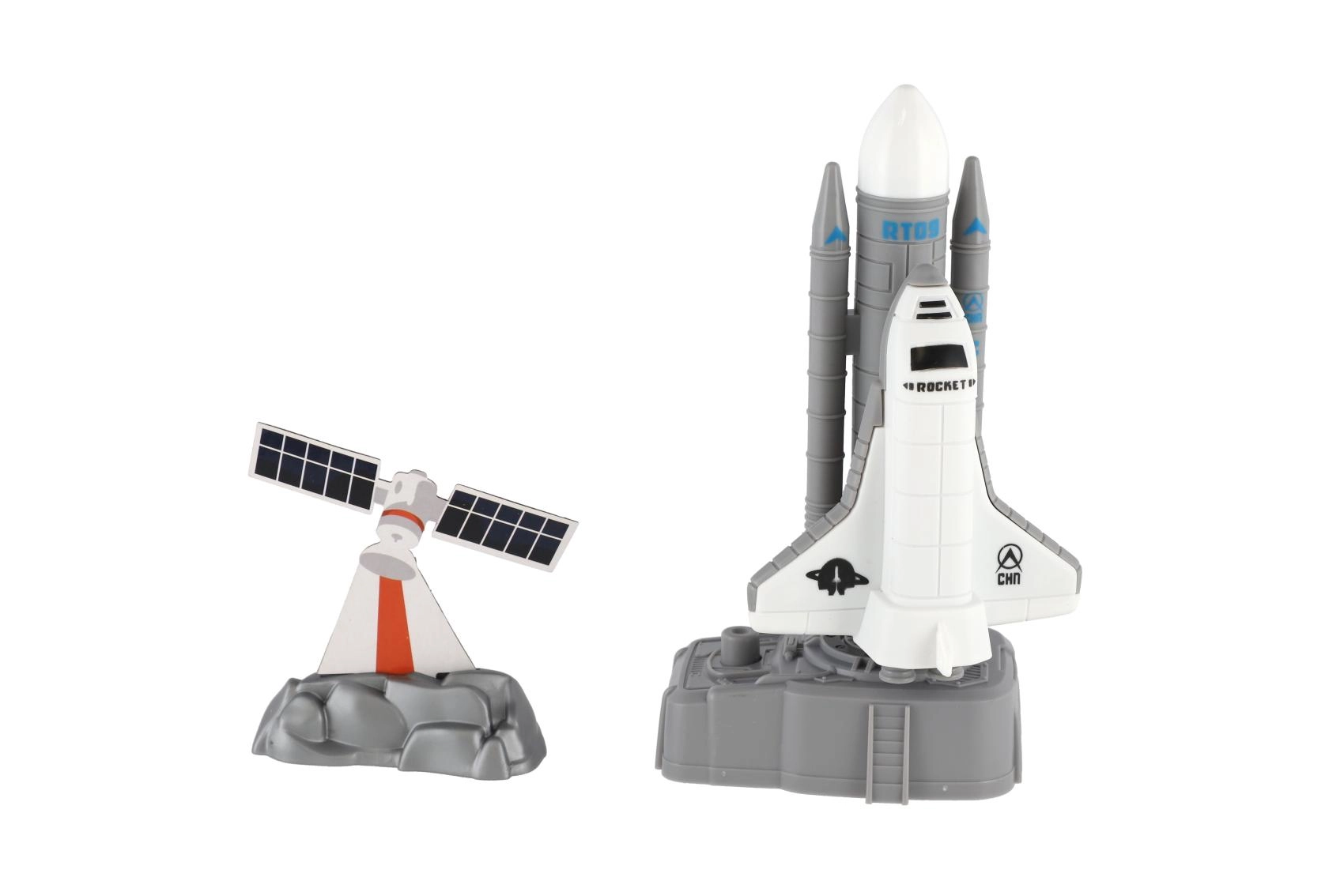 Bel raketoplan s pospeševalniki na sivi izstrelitveni ploščadi omogoča otrokom znova in znova simulirati začetek misije. Odstranljivi deli povečujejo raznolikost igre.