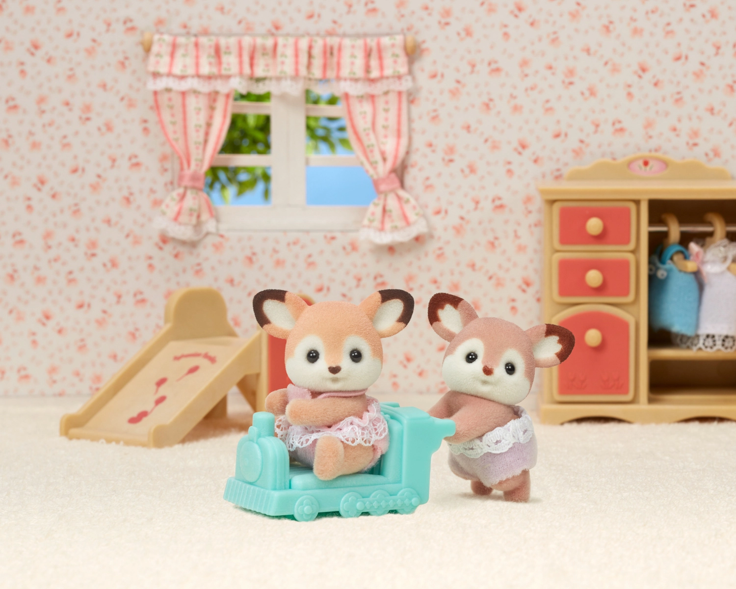 Odkrijte čar sveta SYLVANIAN FAMILIES s čudovitima jelenčkovima dvojčkoma Nilsom in Lido. Figurice imajo mehko, rahlo flockano površino, prisrčna ušesa in so oblečene v barvne hlačke z čipko. Priložen je tudi lahek voziček v obliki vlakca, ki ga lahko kombinirate z vozički iz drugih kompletov dvojčkov za še večje možnosti igre.