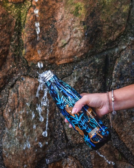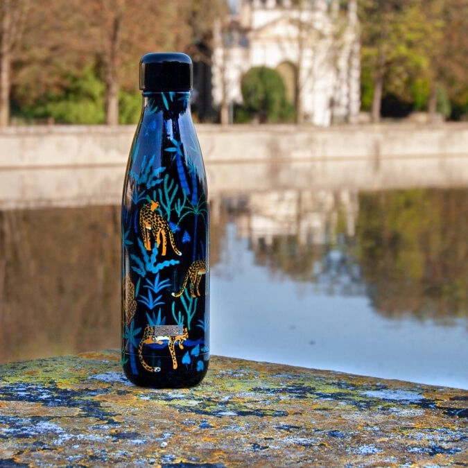 Odkrijte praktično in elegantno steklenico za pijačo z motivom džungle in jaguarjev. Kovinska konstrukcija pomaga dlje časa ohraniti temperaturo pijač, medtem ko trden navojni pokrov zagotavlja tesnjenje pri prenašanju v torbi ali nahrbtniku.