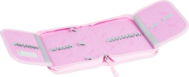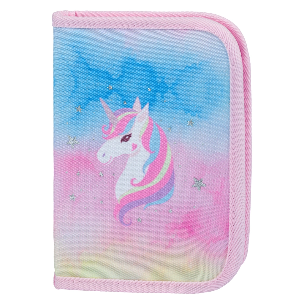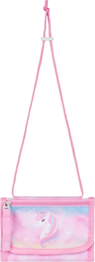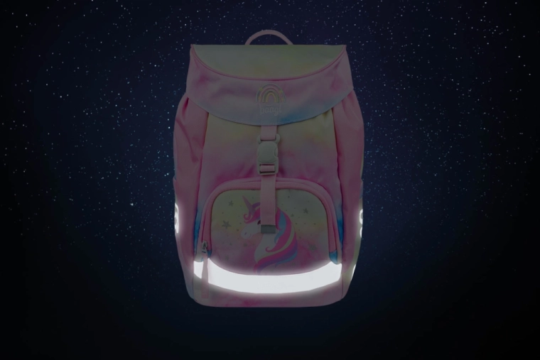 Set dopolnjuje enoslojna peresnica z dvema preklopoma in zadrgo YKK, praktična vrečka s sprednjim žepom na zadrgo in zankico za pripenjanje na nahrbtnik, pralni predpasnik z dvema žepoma za ustvarjanje in dejavnosti ter varna denarnica za okoli vratu s predalčki. Vse v enotnem pastelnem dizajnu s samorogi in odsevnimi elementi za večjo vidnost.