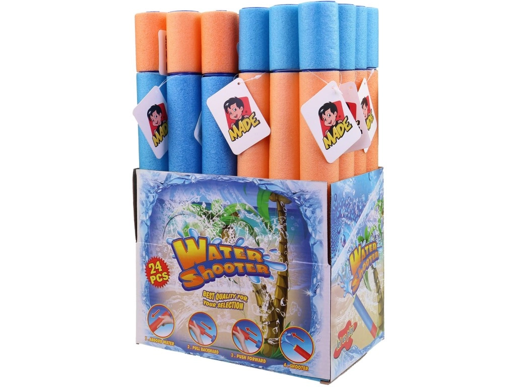 Praktično pakiranje 24 kosov v display boxu je idealno za vrtce, tabore, otroške dogodke ali maloprodajo. Pumpa ima kompaktno dolžino 38 cm, zato jo udobno držijo tudi mlajši otroci, hkrati pa je popolna za igre ob bazenu, na vrtu in na plaži.