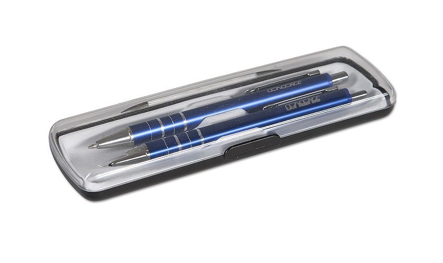 Eleganten darilni set CONCORDE Ring bo razveselil vsakogar, ki ceni kakovostne pisalne potrebščine. Vsebuje kroglično pero 0,7 mm in mehanski svinčnik 0,5 mm v sijočem eloksiranem aluminiju z kovinsko sponko. Priložena je modra polnilo A3 in praktično plastično ohišje za varno shranjevanje in dovršeno predstavitev.