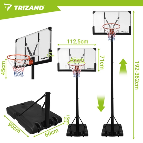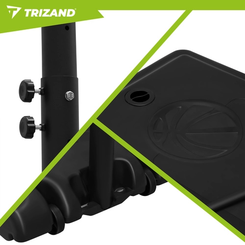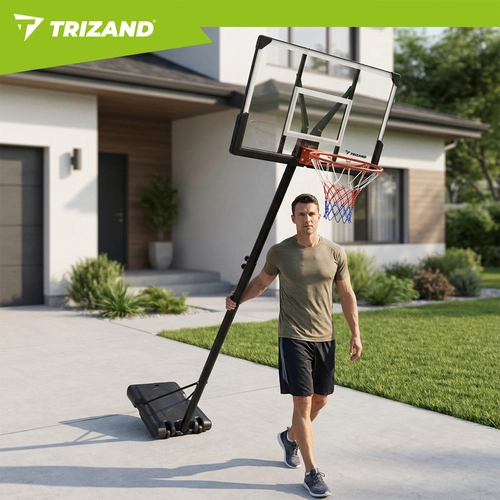 Košarkarski koš TRIZAND je popoln trenažni komplet za rekreativno igro in vsakodnevni trening. Nastavljiva višina 135–305 cm raste z igralci in omogoča pravilno nastavitev za male začetnike in odrasle. Robustna jeklena konstrukcija in osnova z možnostjo obtežitve z vodo ali peskom zagotavljata varno stabilnost pri metih in skokih.