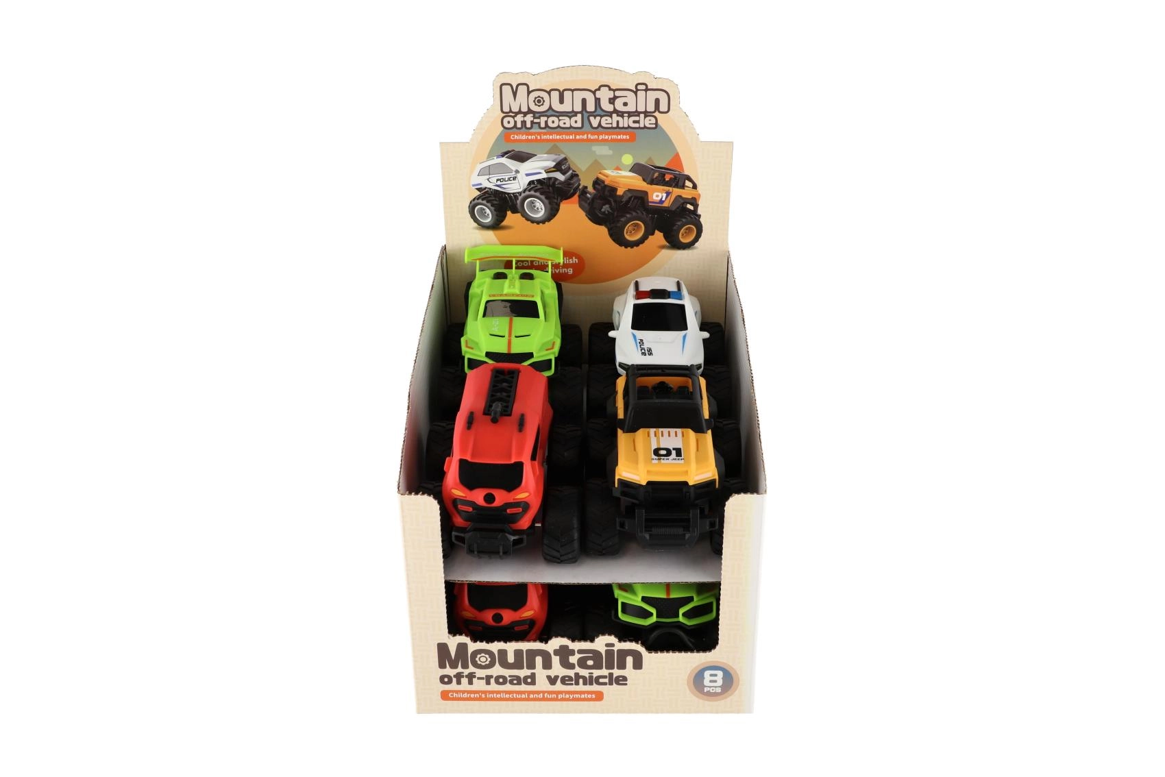 Odkrij zabavo s kompaktnih monster truckov, ki zlahka premagajo izbokline, preproge in manjše ovire. Pogon na vztrajnik omogoča hitro vožnjo brez baterij, velika traktorska kolesa pa zagotavljajo stabilnost tudi v ovinkih. V pakiranju je 8 kosov v 4 različnih dizajnih, vključno s policijskim in gasilskim motivom – idealno za dirke in igro vlog.