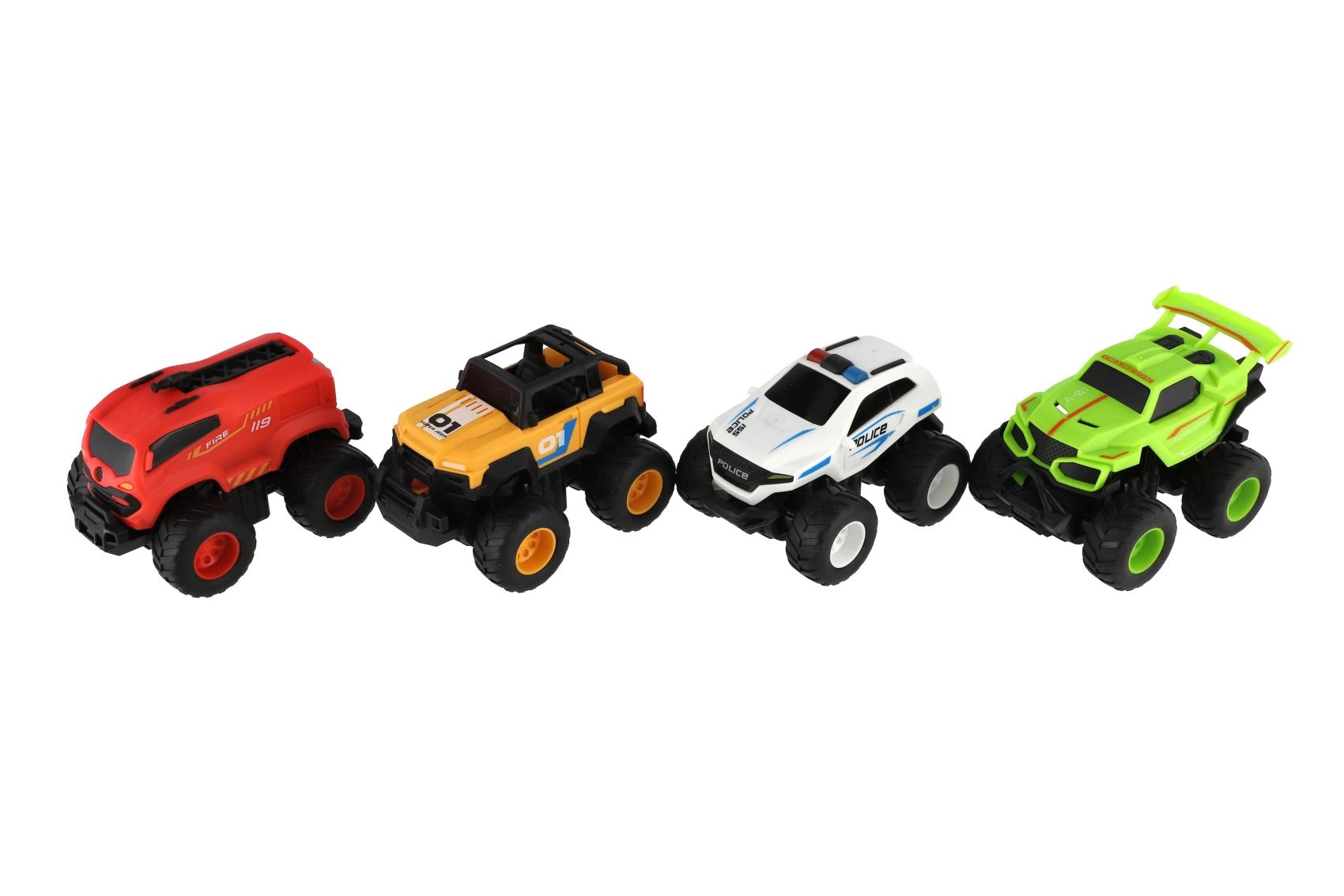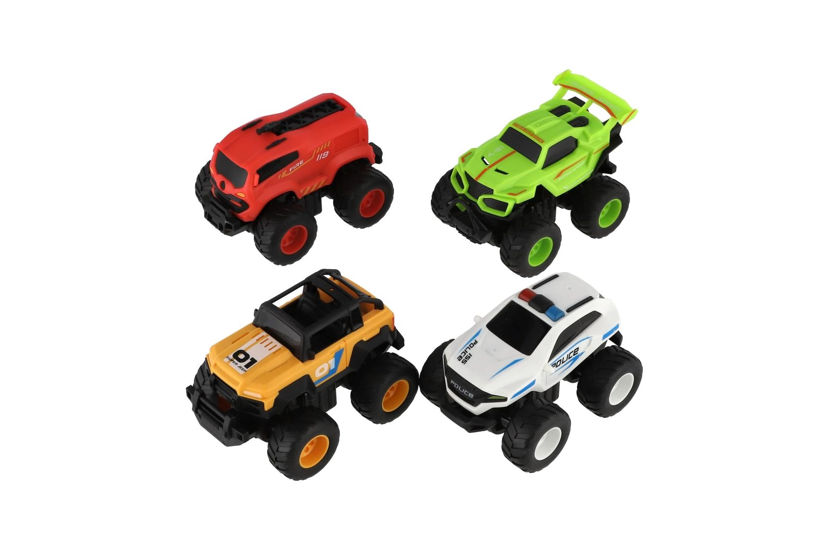 V kompletu najdeš dirkalno, policijsko in gasilsko izvedbo ter športni monster truck – odlično za domišljijsko igro vlog in zbiranje.