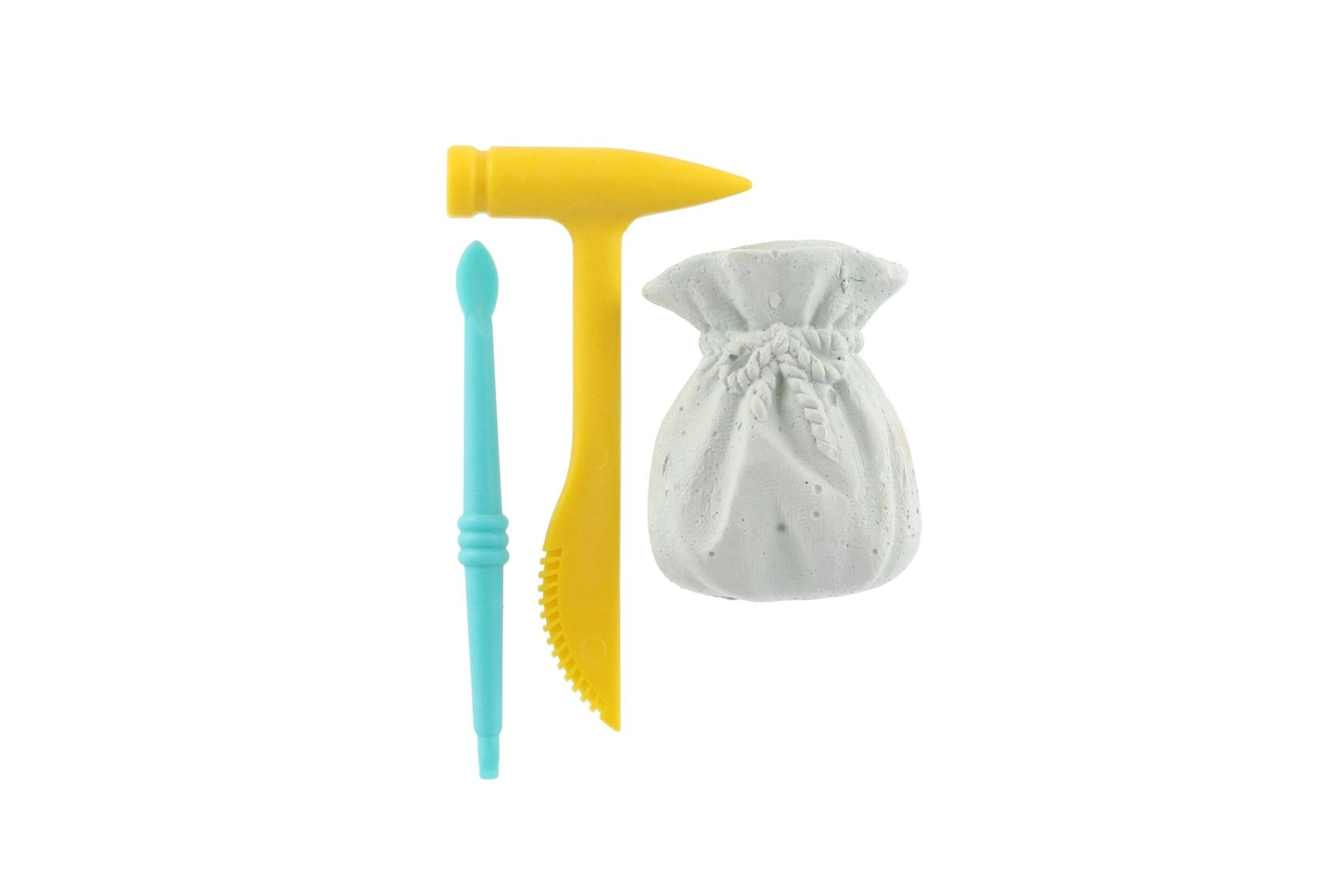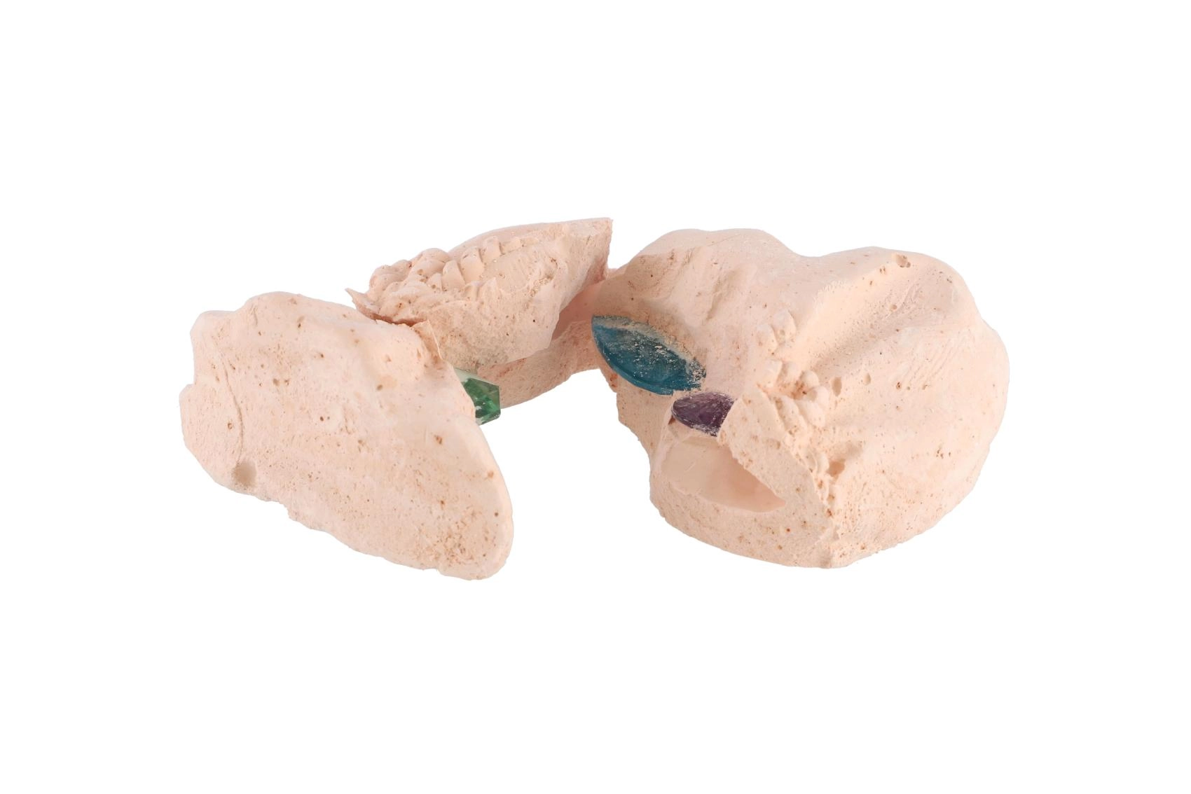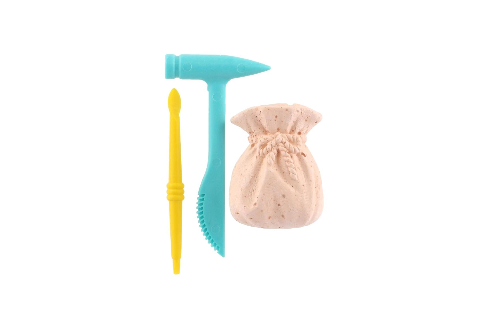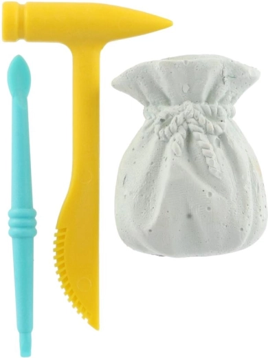 Odkrijte fascinanten svet geologije in arheologije s kompaktnim kompletom, ki skriva barvne kamenčke v bloku, podobnem mošnjičku. Otroci uporabijo lahka plastična orodja – kladivce in dletce/čopič – ter postopoma razkrijejo skriti dragulj. Material bloka je zasnovan za enostavno in varno odsekavanje.