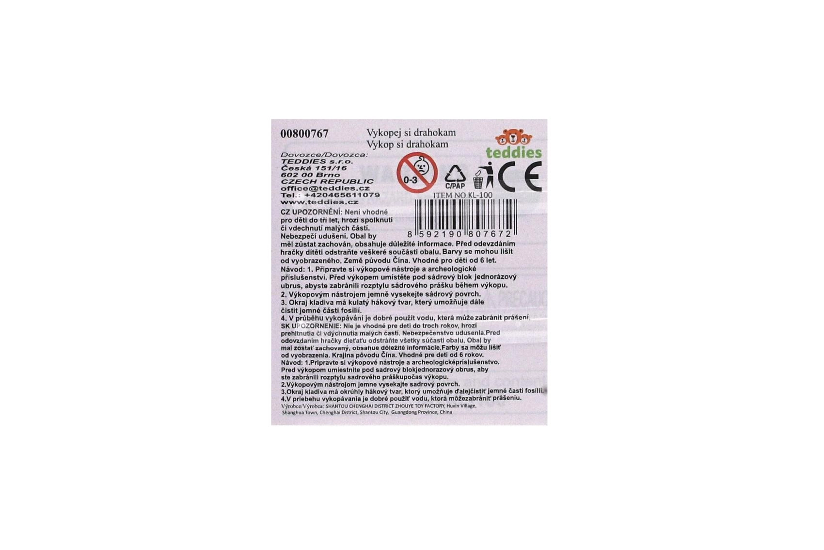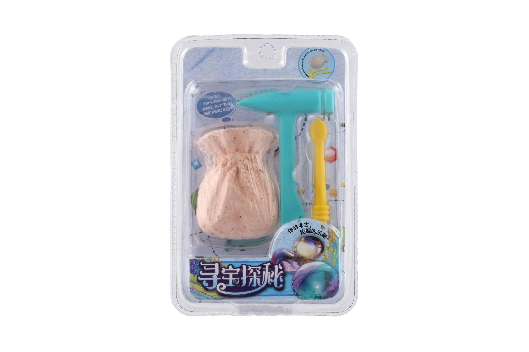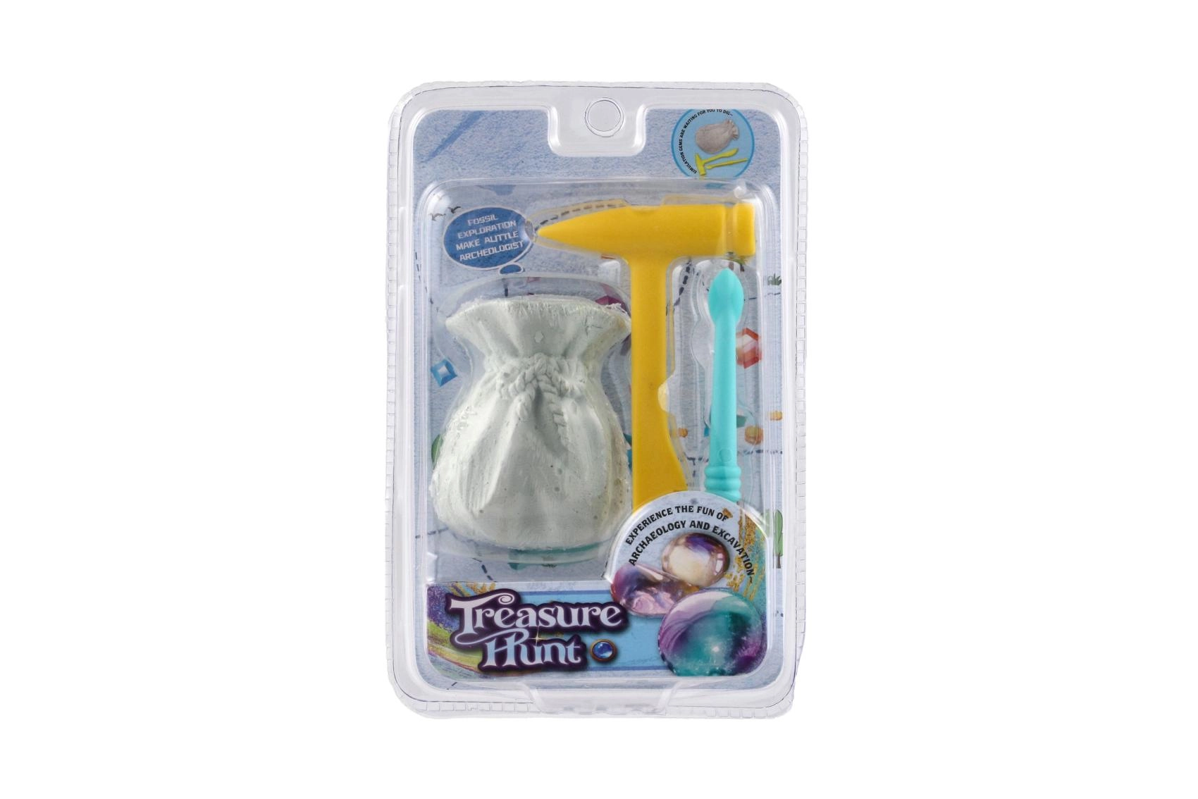 Kompakten blister vsebuje kladivce, dletce/čopič in blok v obliki mošnjička s skritim kamnom – pripravljeno za izkopavanje takoj po odprtju.