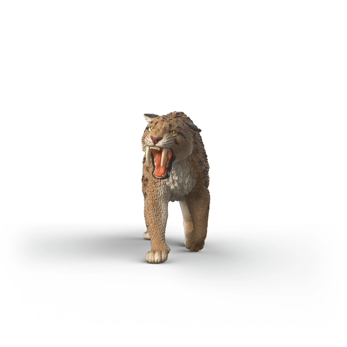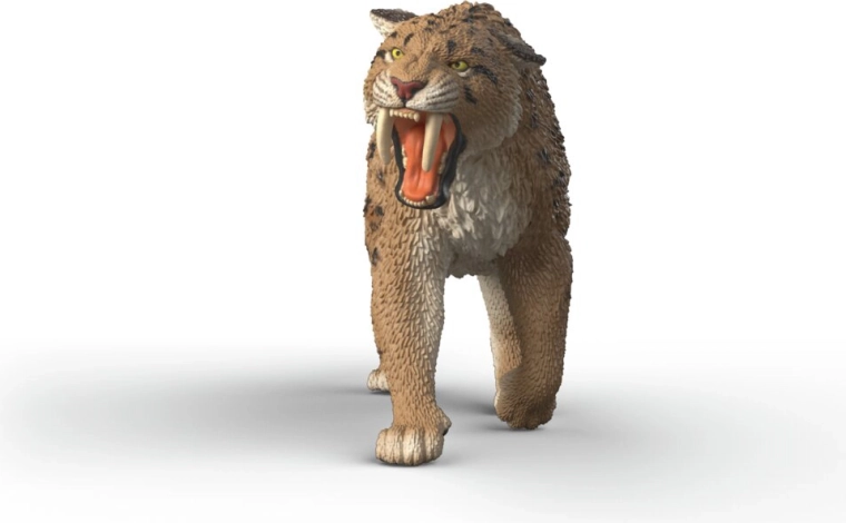 - Realistični detajli: teksturiran kožuh, naslikane lise in izraziti sabljasti čekani.