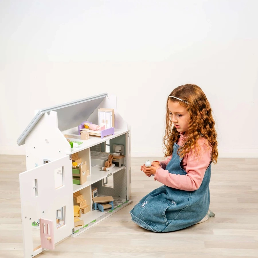 Komplet vsebuje 31 skrbno izdelanih kosov za dnevno sobo, kuhinjo, kopalnico in dve spalnici – otroci lahko zlahka opremijo vsak prostor in spreminjajo postavitve po svoji domišljiji.
