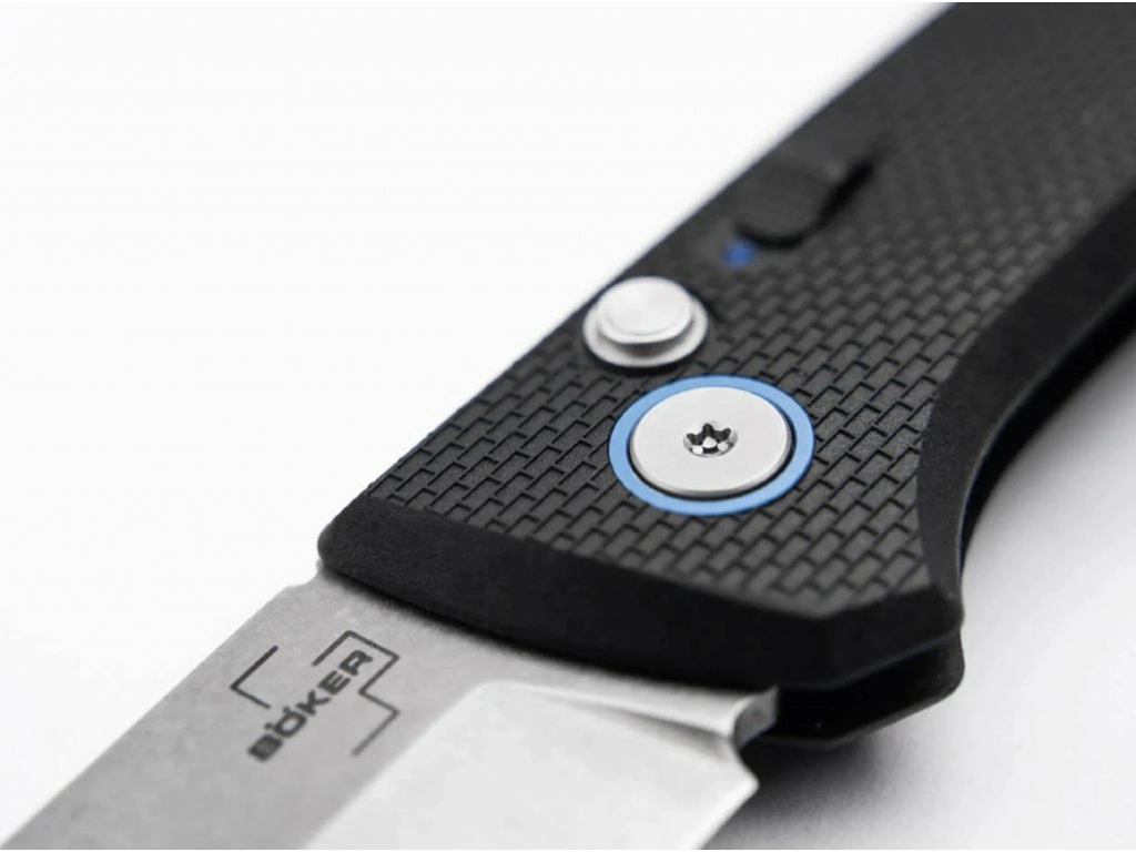 Ročaj iz lahkega in vzdržljivega materiala Grivory z teksturirano površino varno leži v roki. Avtomatsko odpiranje s pritiskom na gumb je hitro in tekoče, medtem ko dvojna varovalka zmanjšuje tveganje nenamernega odpiranja. Modro eloksirani detajli dodajo nožu premijski videz, žična sponka pa omogoča diskretno nošenje v žepu.