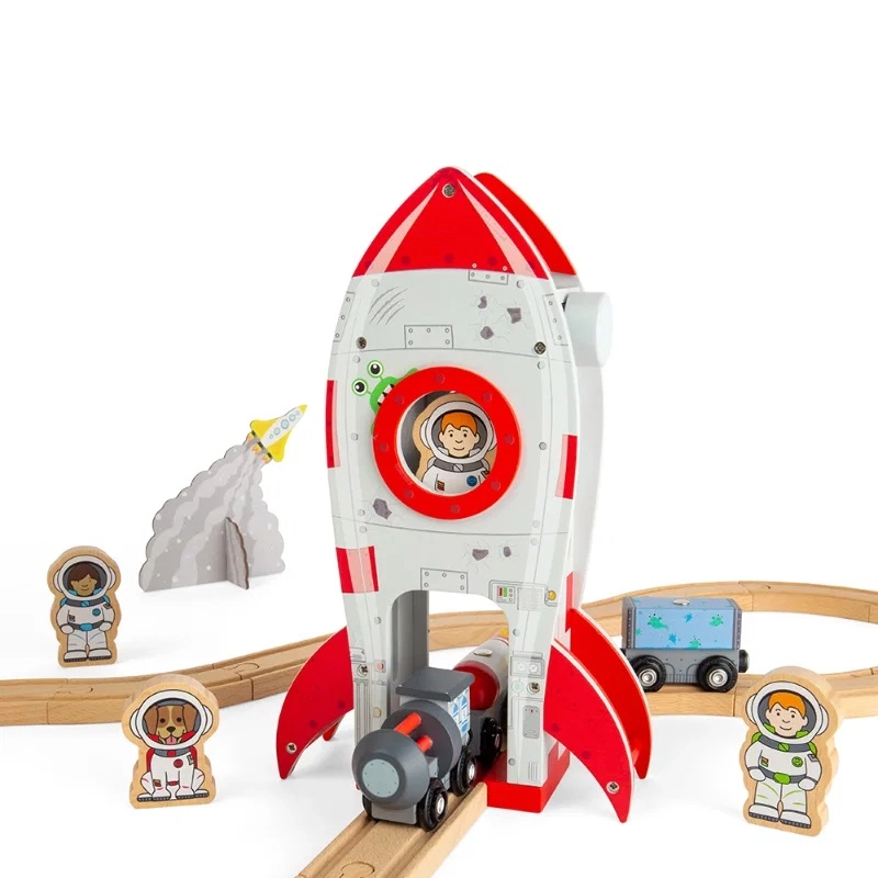 Raketa je izdelana iz kakovostnega lesa s certifikatom FSC in ima odporno zasnovo, primerno za vsakodnevno igro. Otroci razvijajo domišljijo, komunikacijo in koordinacijo rok zahvaljujoč preprosti uporabi dodatkov. Združljivost z večino lesenih prog za vlakce zagotavlja brezhibno razširitev vašega seta.