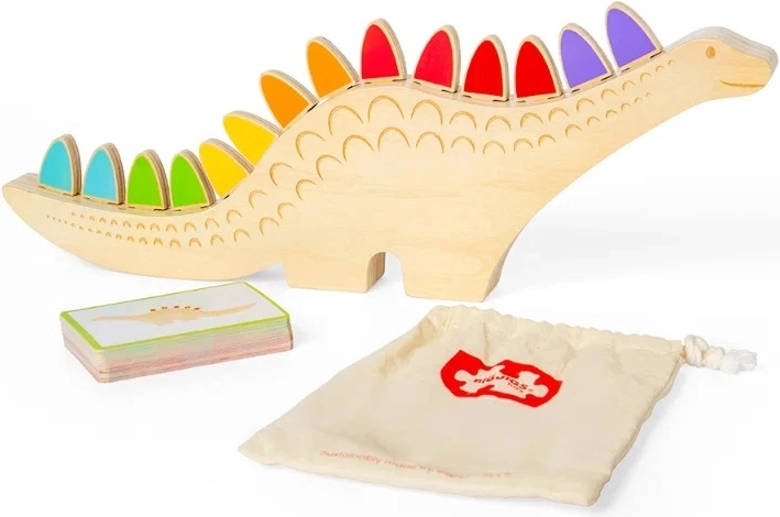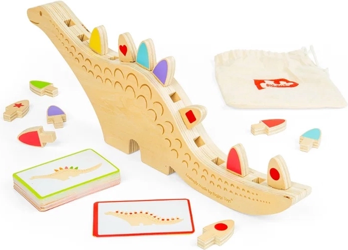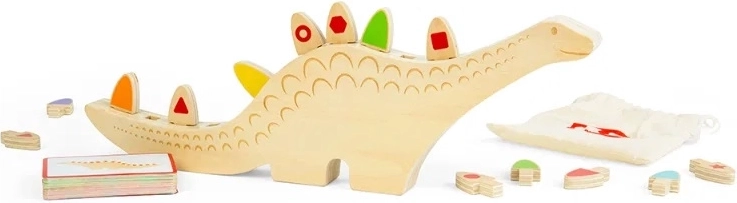 Ta ustvarjalna ravnotežna in sortirna igra z motivom dinozavra prinaša številne igralne scenarije. Otroci lahko dele barvno ali oblikovno ujemajo po navodilih na kartah ali jih poskušajo uravnotežiti in zlagati v utore na hrbtu dinozavra. Odprta igra spodbuja samostojnost, osredotočenost in potrpežljivost.