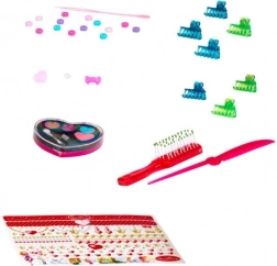 Bogat komplet dodatkov vključuje glavničke, krtačo, barvite sponke, kroglice, trakove, nalepke in srčasto paleto »make-upa«. Lasje so mehki, gosti in se dobro razčešejo, zato prenesejo pogosto česanje in ponavljajoče se pričeske brez izgube kakovosti. V pakiranju boste našli tudi slikovne napotke za lahko inspiracijo.