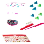V pakiranju najdete glavnik, krtačo, majhne ščipalke, kroglice, trakove, nalepke in paleto – vse za stiliranje in okraševanje.