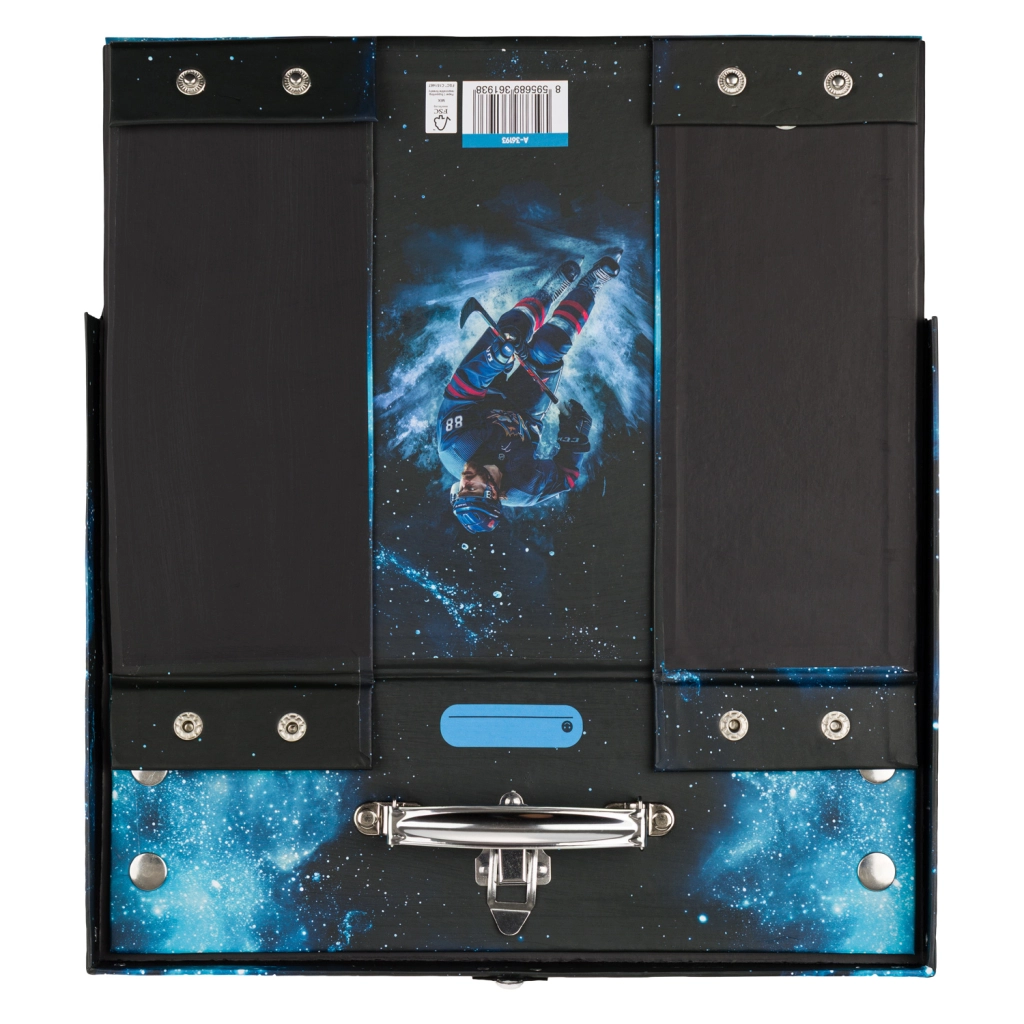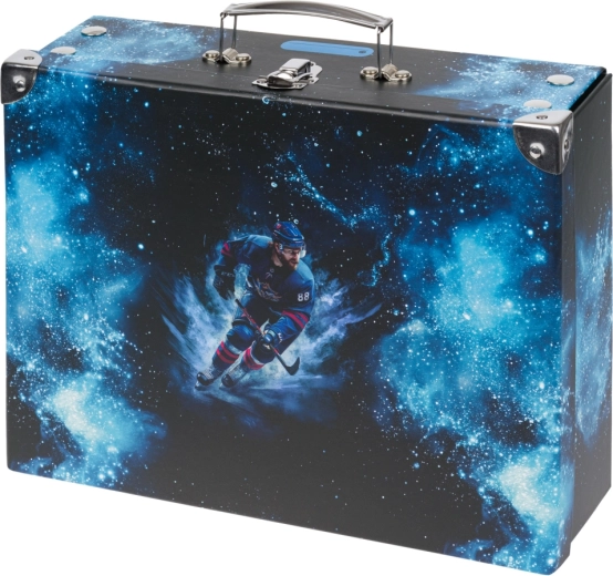 Praktičen in stilen šolski kovček z motivom hokeja znamke BAAGL za pregledno shranjevanje likovnih pripomočkov, igrač in drobnarij. Hitro zlaganje in razstavljanje zahvaljujoč sistemu z neti, ojačani kovinski vogali in zanesljivo kovinsko okovje zagotavljajo dolgo življenjsko dobo. Udobno nošenje omogoča kovinski ročaj in klasično zapiranje na zaponko. Izdelan iz trdnega laminiranega papirja.