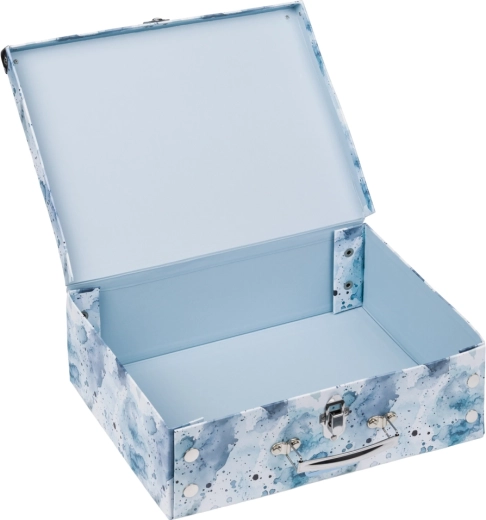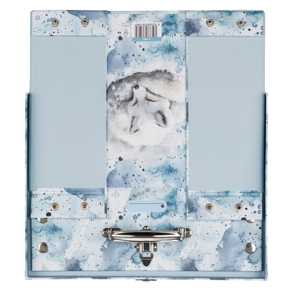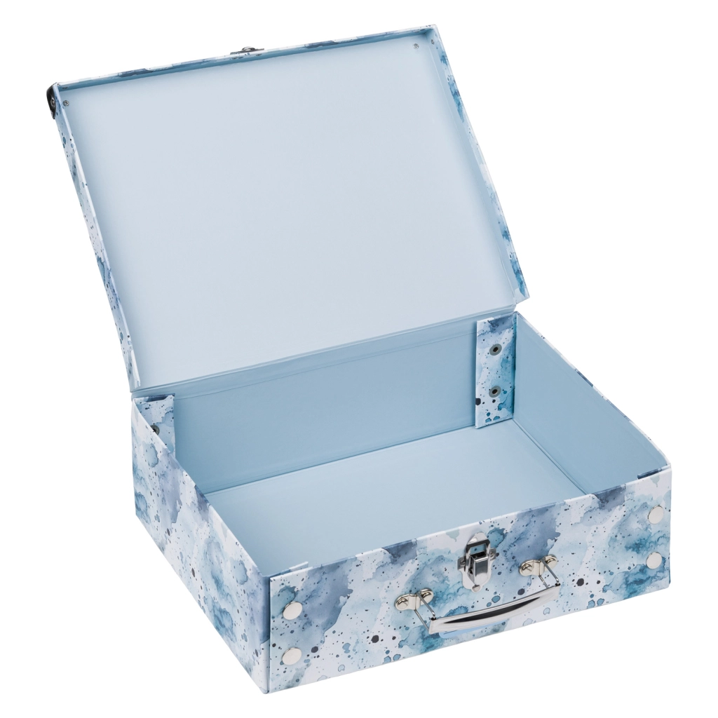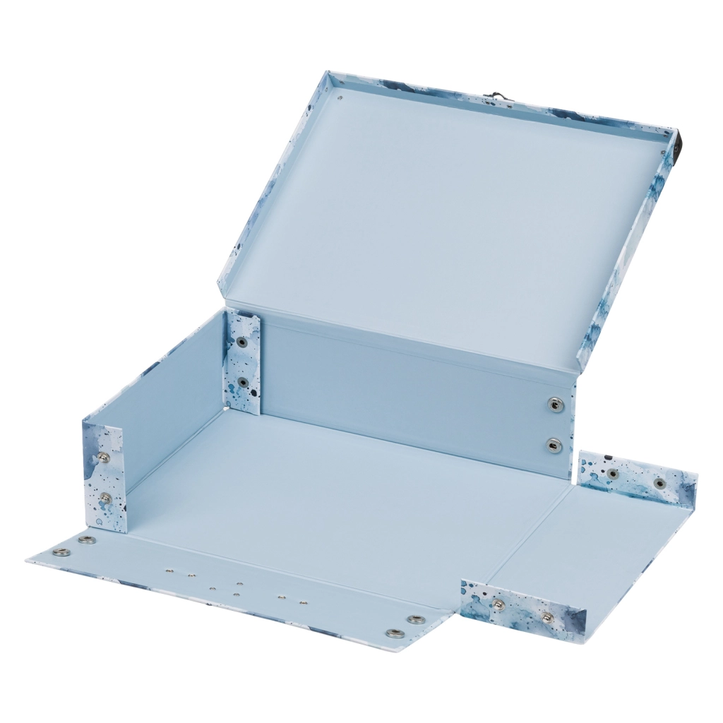 Praktična izvedba s klasično zaponko in udobnim kovinskim ročajem omogoča enostavno prenašanje. Površina iz čvrstega laminiranega papirja je enostavna za vzdrževanje in odporna proti običajni obrabi.