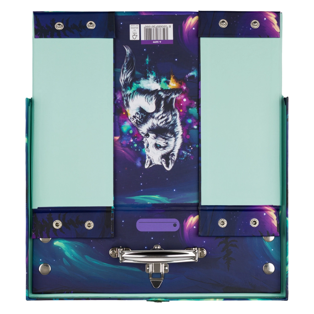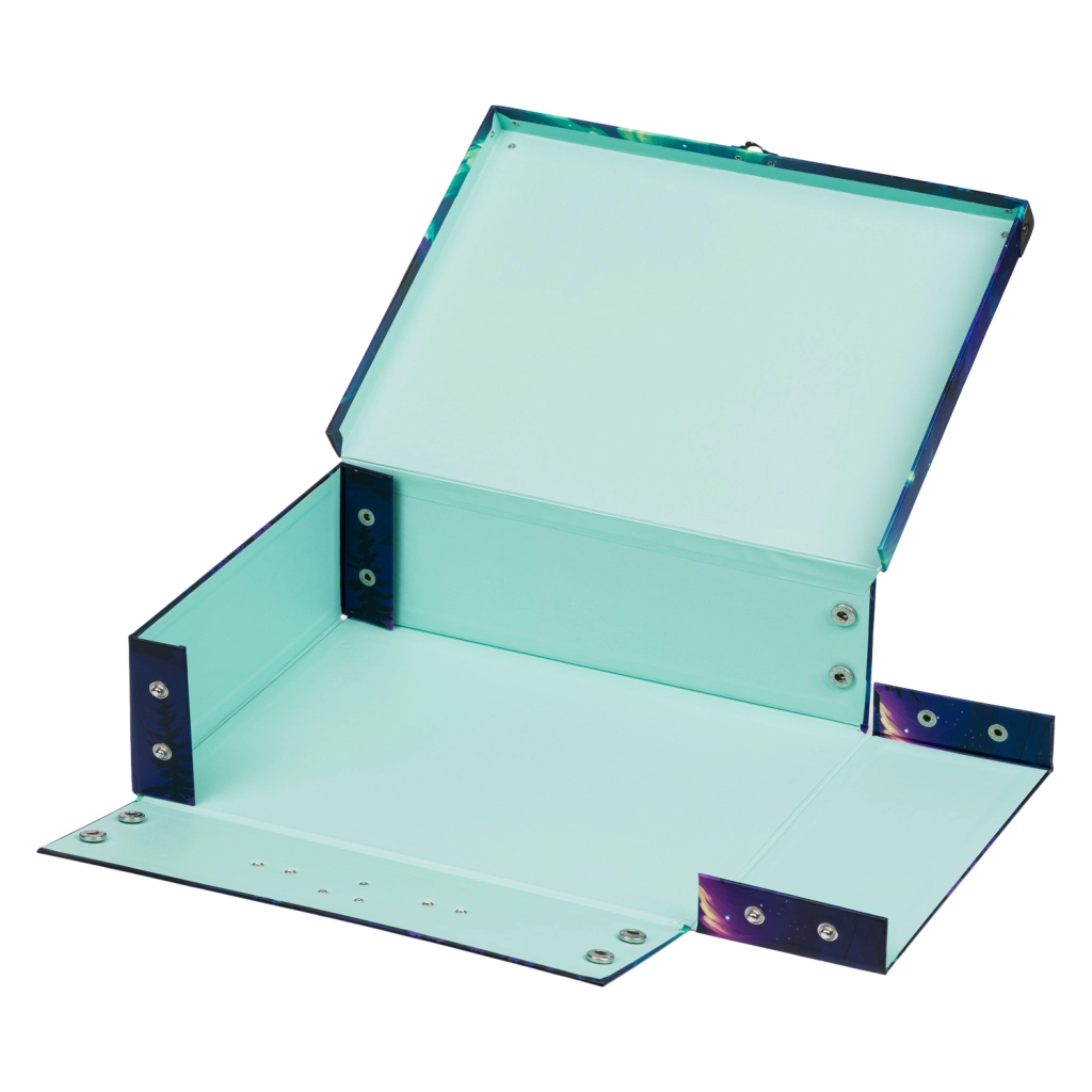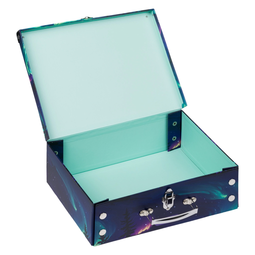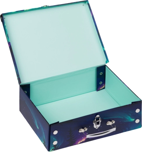 Kovinsko ojačani vogali povečajo odpornost proti udarcem, medtem ko kovinski ročaj in zapenjanje z zaponko olajšata prenašanje. Trden laminiran papir daje kovčku stabilnost in dolgo življenjsko dobo, zato varno shrani likovne potrebščine, papirje, zvezke in manjše igrače.