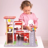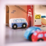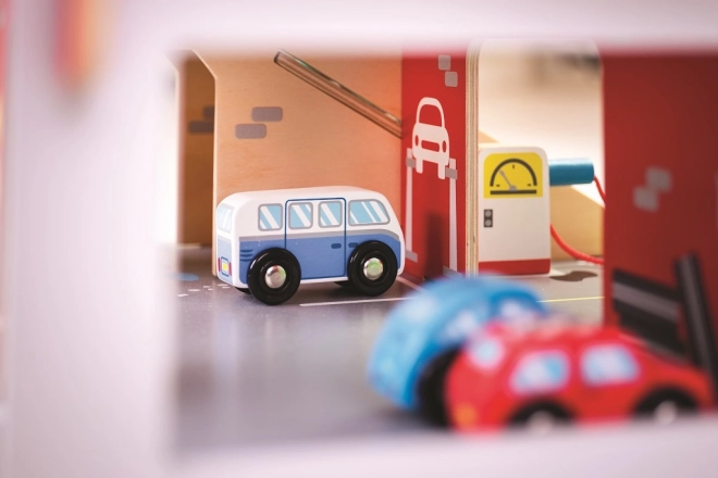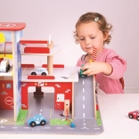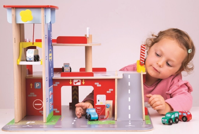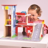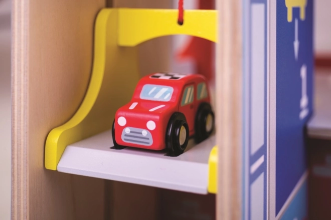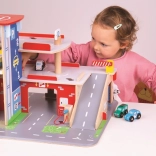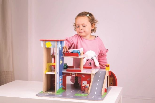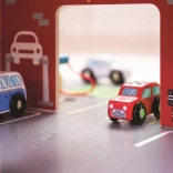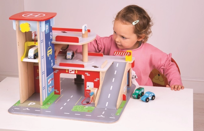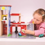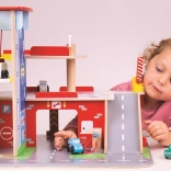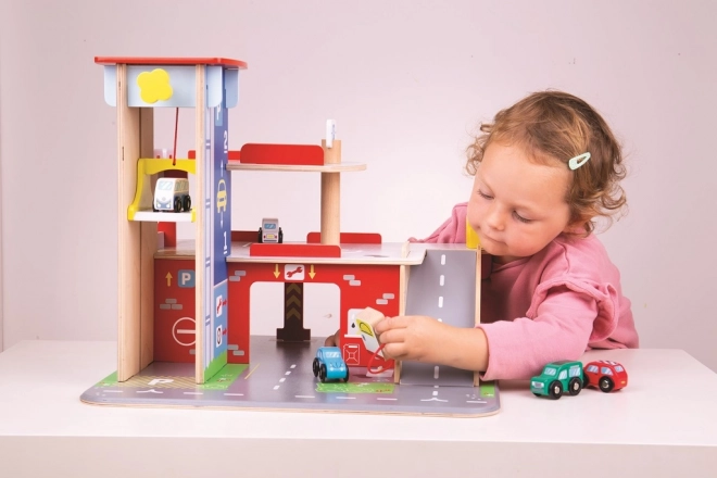 Otroci bodo uživali v zabavni igri na vsakem od treh nadstropij garaže s parkiriščem. V pritličju lahko z avtom zapeljejo v delujoče dvigalo in se nato zapeljejo do drugega nadstropja ter tam parkirajo. V pritličju bodo našli servis, avtopralnico in črpalko. Iz prvega nadstropja lahko avtomobili odpeljejo z dvigalom ali po rampi, vendar pozor – avtomobili morajo počakati, da se zapornica dvigne! Najvišja točka garaže je heliport. Ta garaža ima preprosto vse, kar mali voznik potrebuje za prevoz od točke A do točke B. Spodbuja ustvarjalnost in domišljijo. Razvija koordinacijo roka–oko, fino motoriko in spretnost. Možno dopolniti z avtomobilčki Bigjigs Toys in Bigjigs Rail. Izdelano iz kakovostnih materialov iz odgovornih virov. Glavne lastnosti: 3 nadstropja s parkiriščem in heliportom; delujoče dvigalo; servis, avtopralnica in črpalka v pritličju