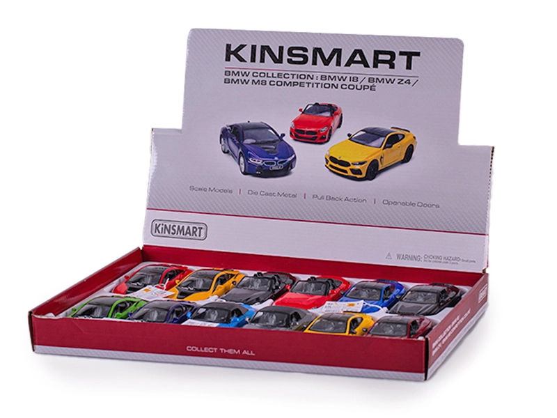 Kovinski modeli Kinsmart v merilu 1:38 prinašajo zveste pomanjšane različice športnih vozil BMW. Zahvaljujoč robustni kovinski konstrukciji s plastičnimi dodatki delujejo modeli premijsko in prenesejo vsakodnevno igro. Odpirajoča se vrata poudarjajo realističnost, povratni pogon (pull-back) pa zagotavlja dinamično vožnjo brez baterij.
