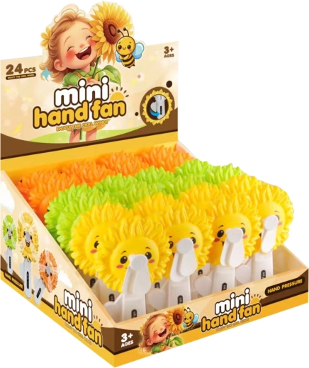Zabaven in praktičen ročni ventilator v obliki sončnice za hitro osvežitev v vročih dneh. Mehanski pogon z vztrajnikom brez baterij, varno plastično krilce in enostavno upravljanje s pritiskanjem ročice – idealen za otroke in odrasle na potovanjih, izletih in ob vodi.