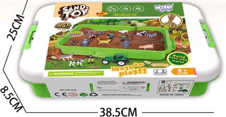 Ustvarite svojo kmetijo in razvijajte otrokovo domišljijo z bogato opremljenim kompletom Woopie. Kinetični pesek je prijeten na dotik, se ne lepi, zlahka drži obliko in ne izsuši, zato je idealen za dolge ure igre. Praktičen zeleni kovček z ročajem služi kot prenosno peskovništvo in shranjevalna škatla – po igri vse preprosto pospravite.