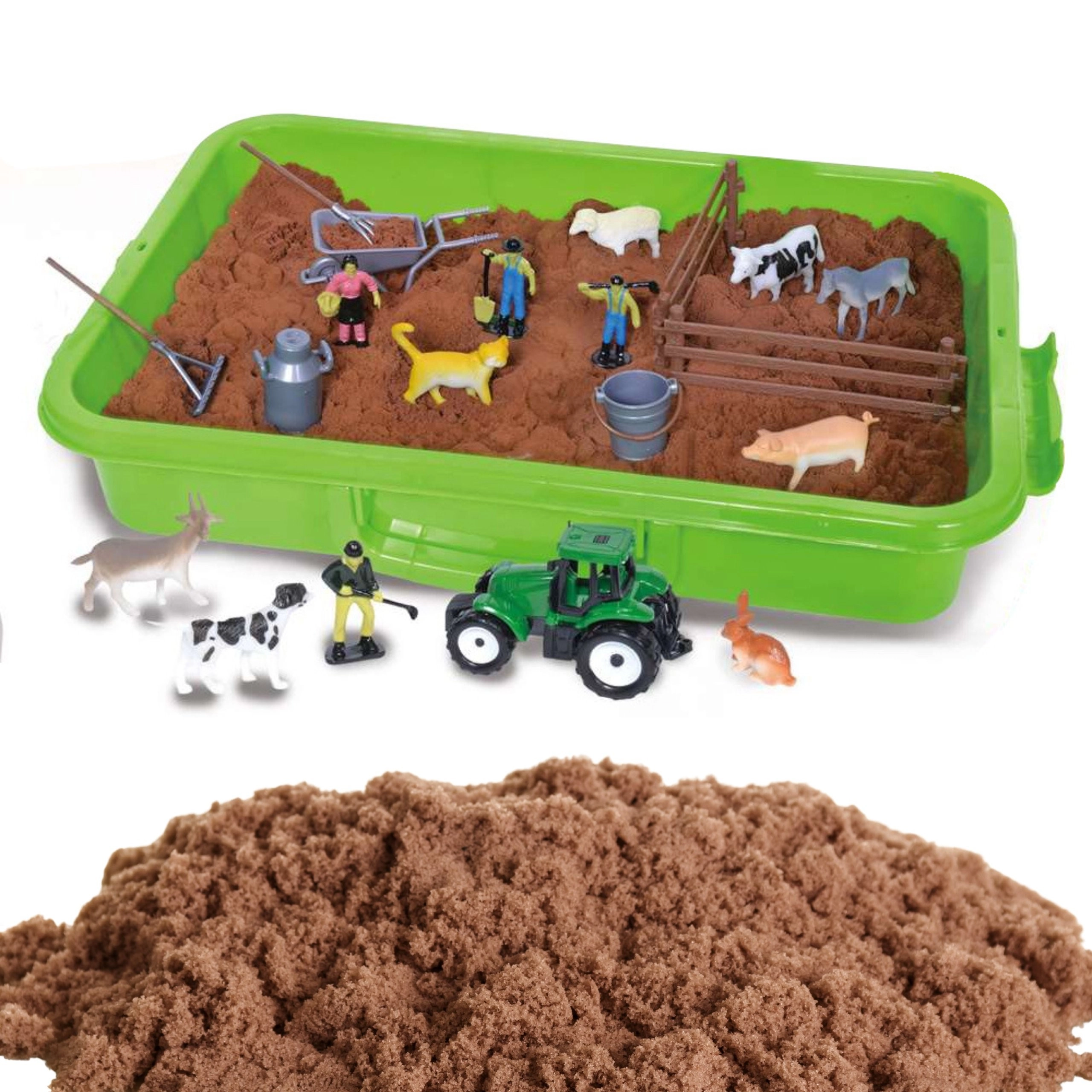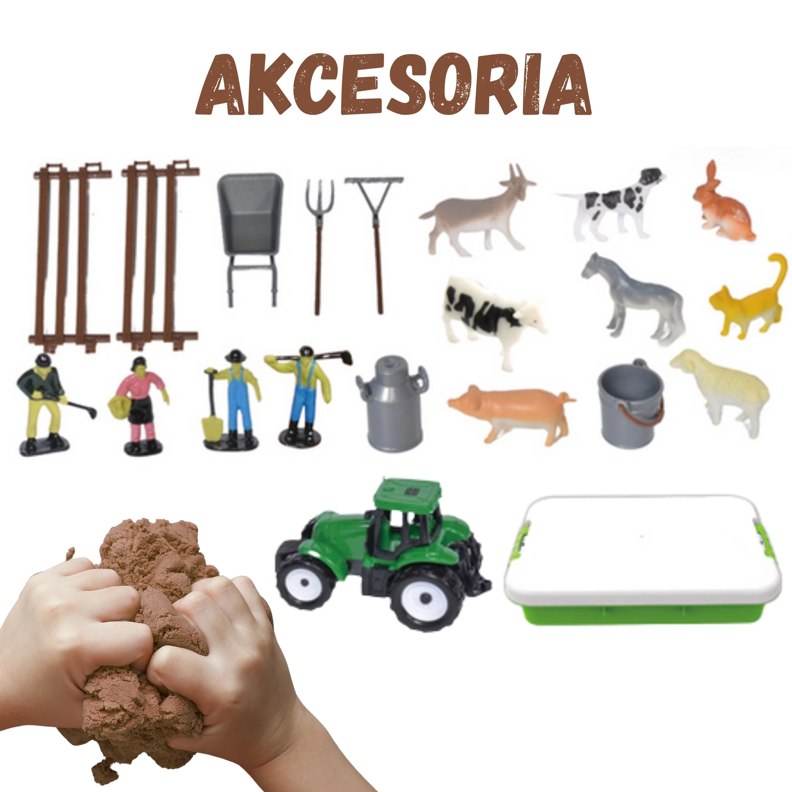 - Kovček/kad, kinetični pesek 1500 g, zeleni traktor, 4 figurice kmetov, figurice živali (konj, krava, ovca, prase, koza, pes, mačka, zajec), 2 dela ograje, samokolnica, vile, grablje, kanta/posoda za mleko, vedro, 6 zip vrečk