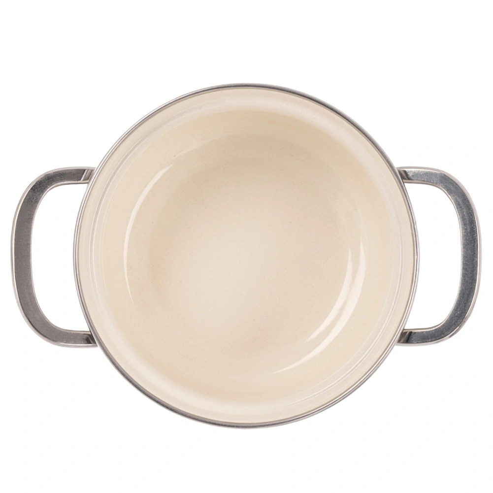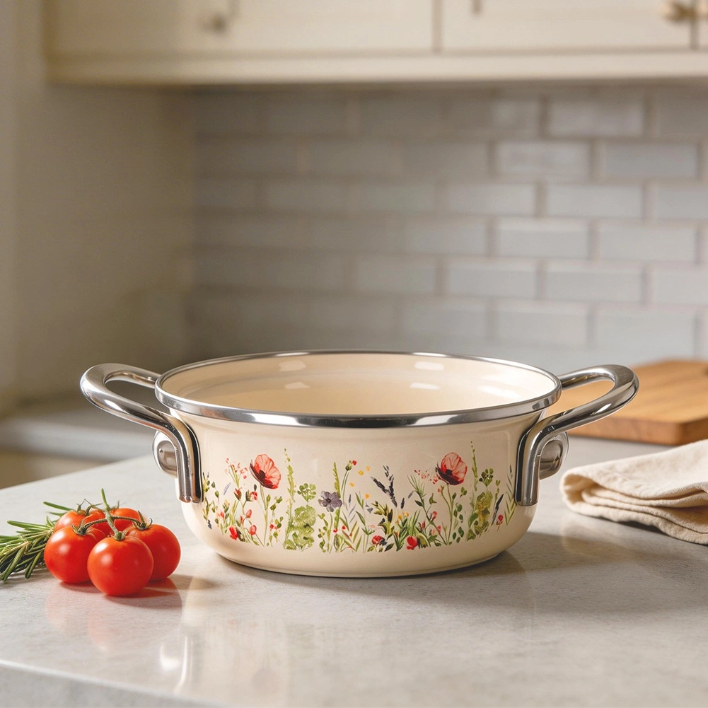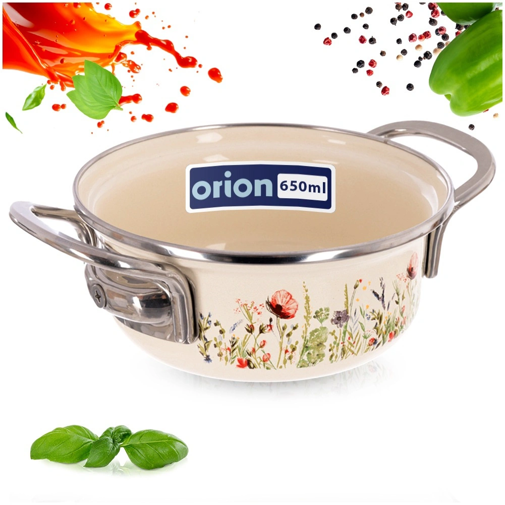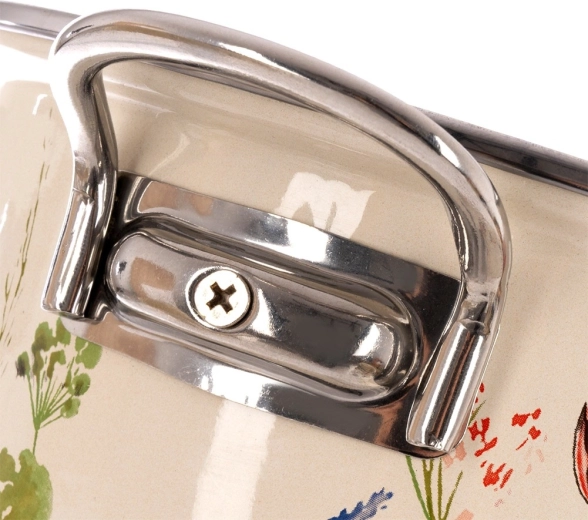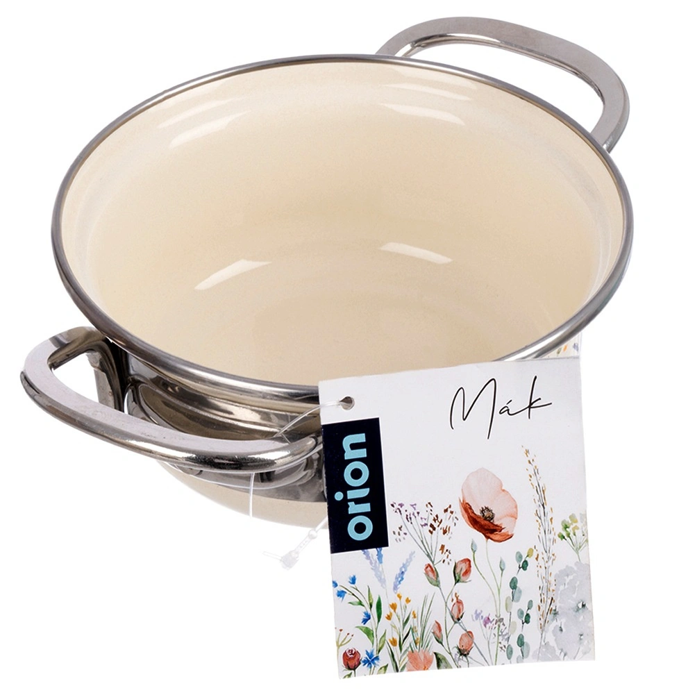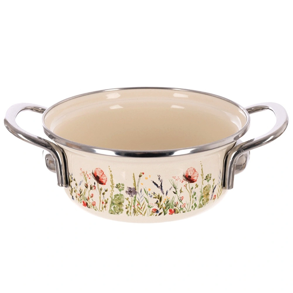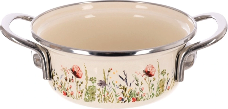 Stilski lonec v retro dizajnu navduši s smetanasto izvedbo s cvetličnim dekorjem in robustno konstrukcijo. Zaradi kompaktne velikosti (premer 14 cm, višina 6 cm, prostornina 600 ml, dolžina z ročaji 20 cm) je popoln za omake, juhe, kaše ali dušenje prilog. Emajlirana površina je higienska, odporna in primerna tudi za alergike.