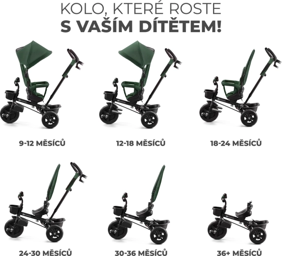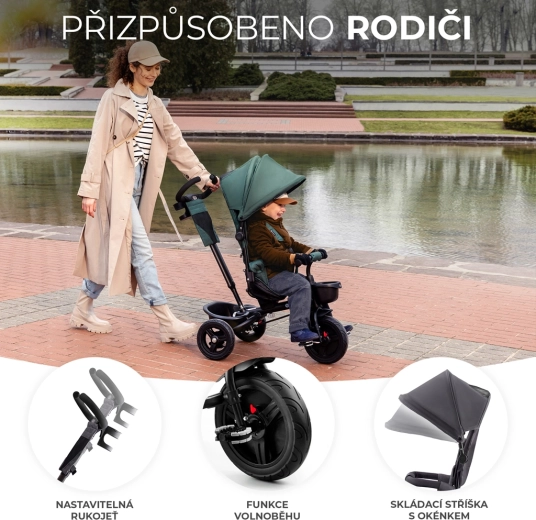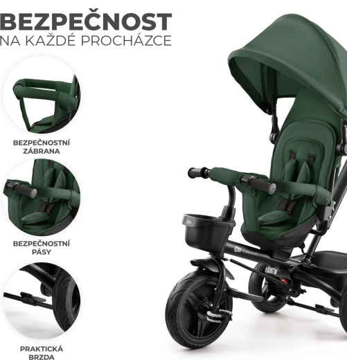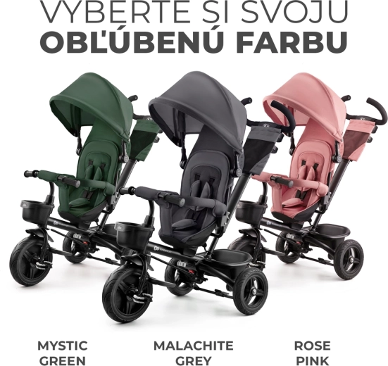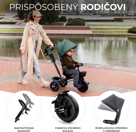 Otroški tricikel Kinderkraft Aveo v barvi Mystic Green je pametna rešitev za otroke od 9 mesecev do približno 5 let. Ponuja vrtljiv sedež v smeri in nasproti smeri vožnje, nepreluknjajoča, brezvzdrževalna kolesa za različne terene ter hitro zlaganje za enostaven prevoz in shranjevanje. Za največjo varnost poskrbijo 3-točkovni pasovi, varnostna ograja in visok naslon za hrbet. Starši bodo cenili nastavljiv ročaj z možnostjo blokade krmiljenja ter praktične dodatke, vključno s košarami in držalom za pijačo.
