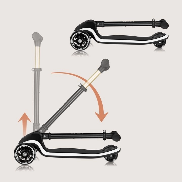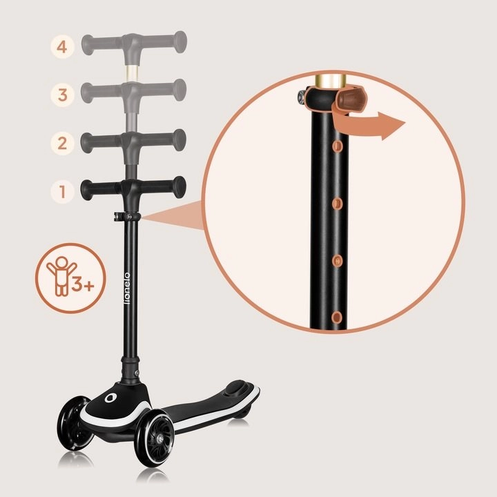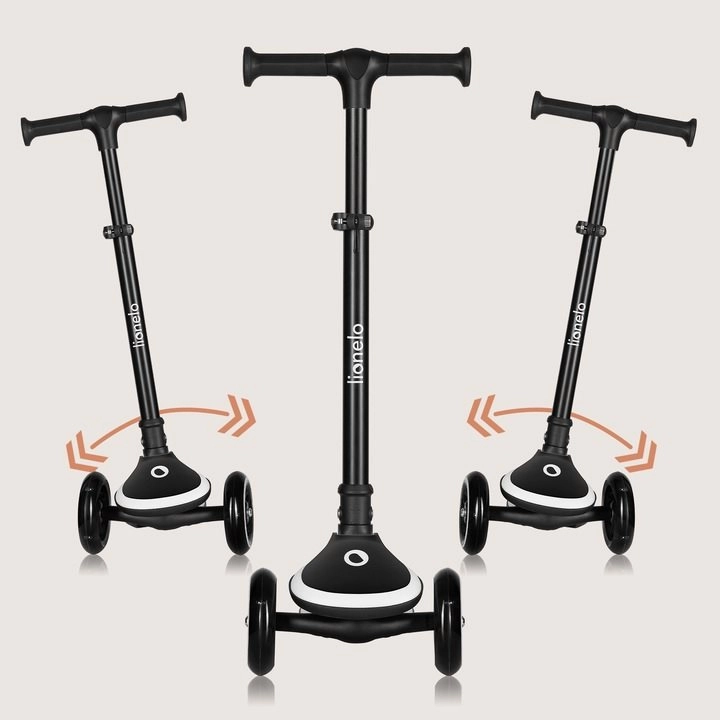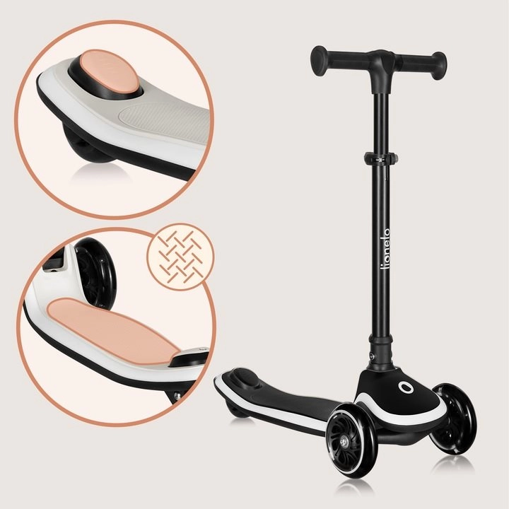 Stilski otroški skiro Lionelo Mey Black Onyx je idealen za otroke od 3 let. Ponuja stabilno vožnjo zahvaljujoč dvema sprednjima kolesoma in sistemu nagibanja, večbarvno LED osvetlitev za odlično vidljivost tudi po temi ter zložljivo konstrukcijo za enostavno prenašanje in shranjevanje. Štiristopenjsko nastavljivo krmilo raste z otrokom, protizdrsna platforma pa poveča varnost tudi na mokri podlagi. Maksimalna nosilnost do 50 kg potrjuje vzdržljivost in dolgo življenjsko dobo.