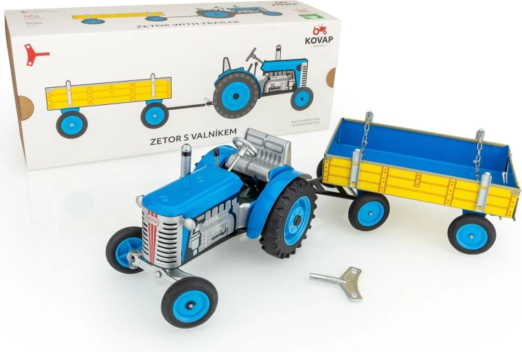 Ta natančno izdelan kovinski traktor ZETOR s prikolico češke znamke KOVAP deluje na klasični navijalni ključ. Zahvaljujoč pravemu menjalniku in ročni zavori ponuja realistično upravljanje in ure zabave. Idealen za otroke od 3 let naprej ter za zbiratelje tradicionalnih pločevinastih igrač.
