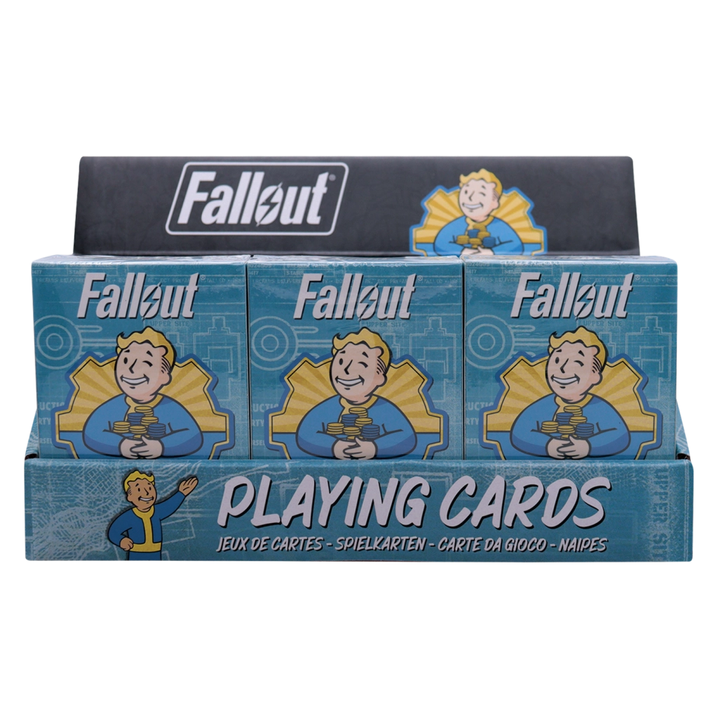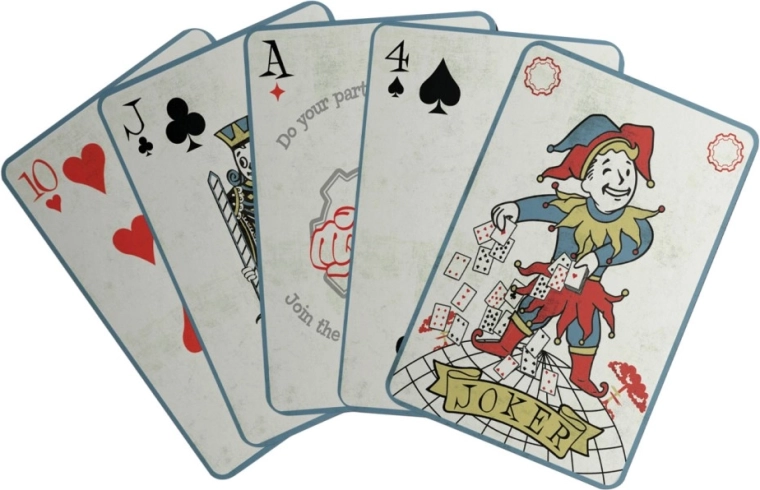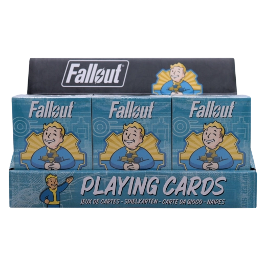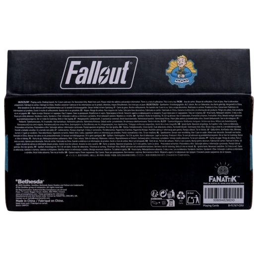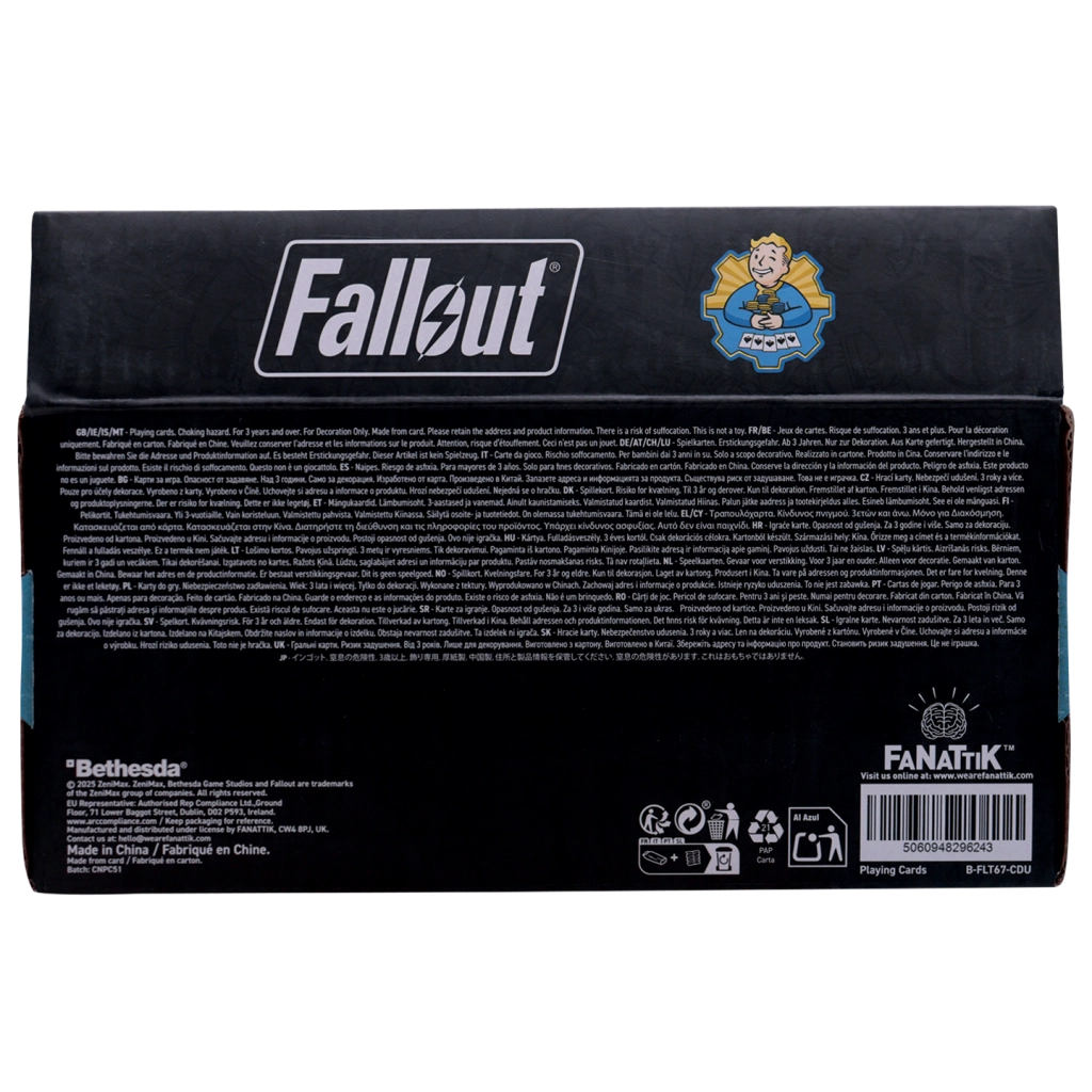 V vsako partijo prinesite edinstveno stilizacijo iz igralne serije FALLOUT. Paket vsebuje klasične igralne karte s standardno obliko in dimenzijami, zato odlično ležijo v roki ter omogočajo tekoče mešanje in deljenje. Vsaka karta je okrašena z avtentičnimi motivi in barvami, ki prikličejo znano postapokaliptično okolje – odtenki rjave, zelene in bež poudarjajo temačno atmosfero sveta Fallout.