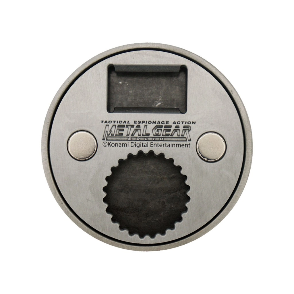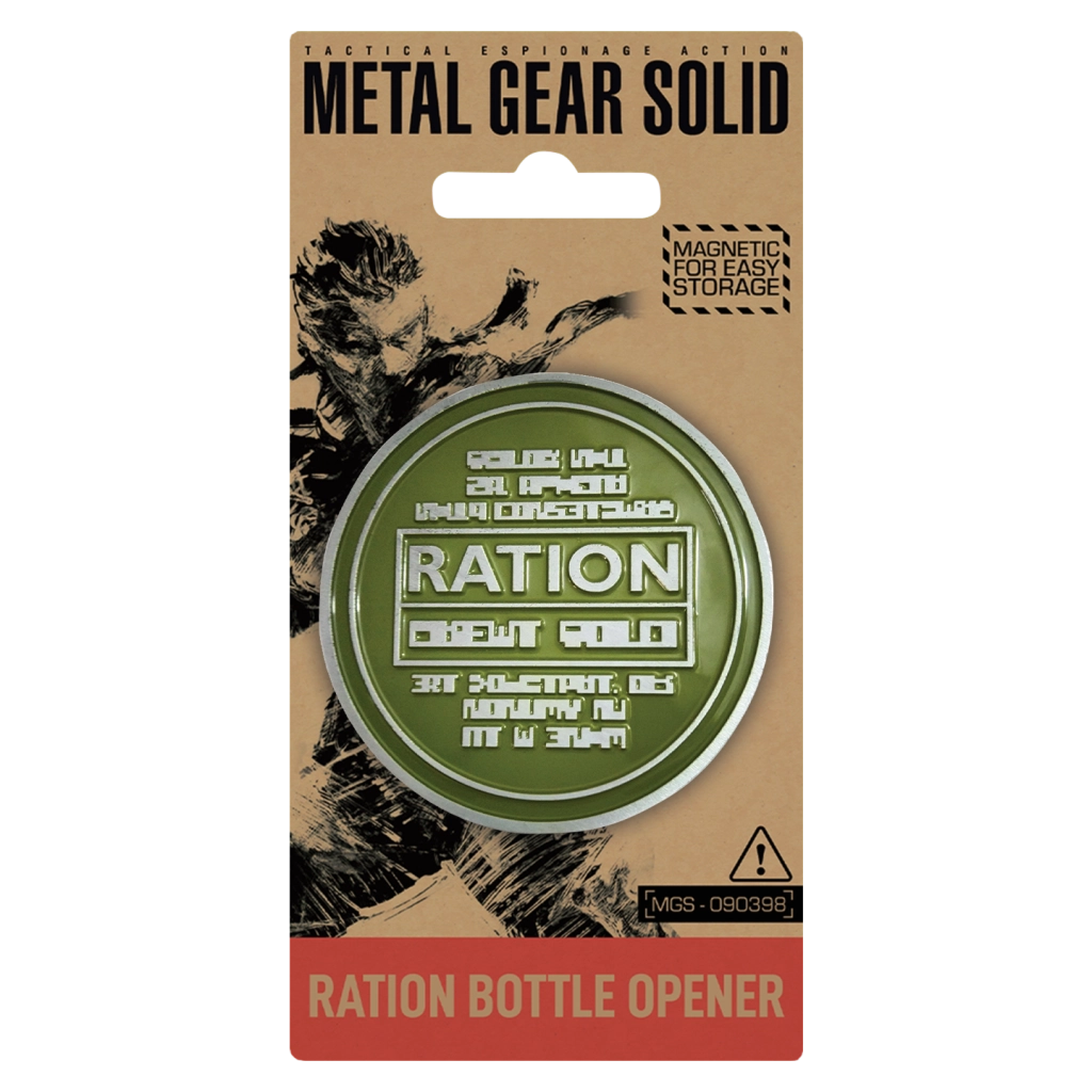 Pokažite svojo strast do igralne serije METAL GEAR SOLID z izvirnim odpiračem v slogu legendarnega “ration packa”. Odporno kovinsko ohišje v vojaško zeleni s črnimi detajli in izrazitim logotipom potrjuje uradno licenciranje ter dodatku daje avtentičen videz.