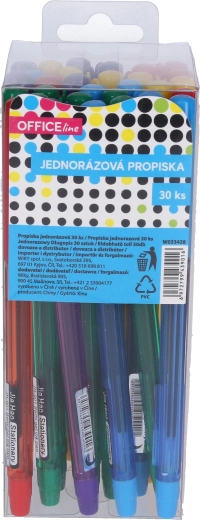 Praktičen in cenovno ugoden komplet enkratnih kemičnih svinčnikov z modrim polnilom v pakiranju po 30 kosov. Lahka zasnova za udobno vsakodnevno pisanje, na voljo v 5 barvnih izvedbah ohišja – vijolična, rumena, rdeča, modra in zelena. Idealno za pisarno, šolo in gospodinjstvo.