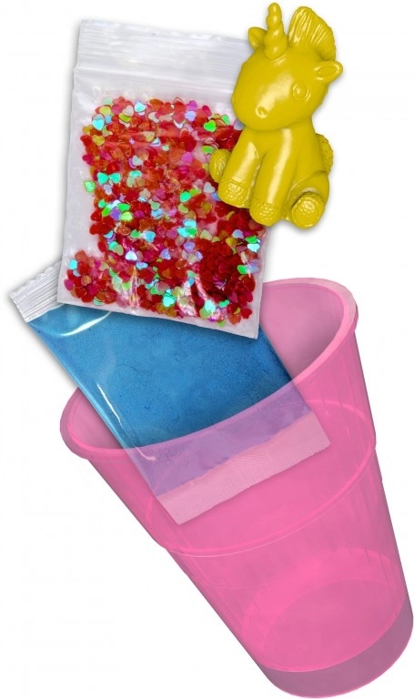 - Lonček s praškom za sluz, dekoracije (bleščice, zvezdice, srčki, zlate bleščice), navodila, mehka živalca – presenečenje