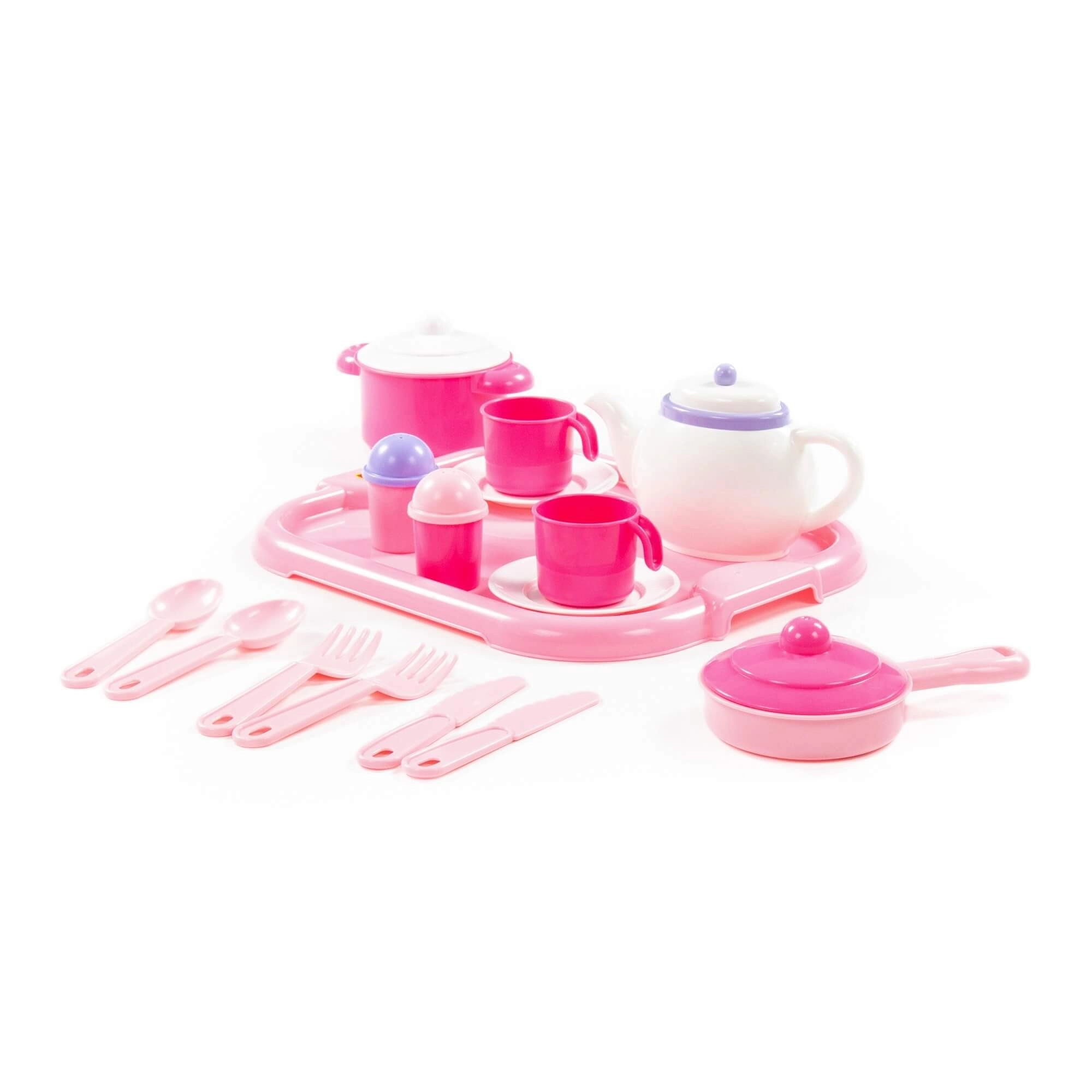 Ta popoln jedilni set za otroke je idealen za igro kuhinje ali restavracije. Vsebuje vse potrebno za realistično postrežbo in obedovanje dveh oseb, vključno s praktičnim pladnjem za enostavno prenašanje.