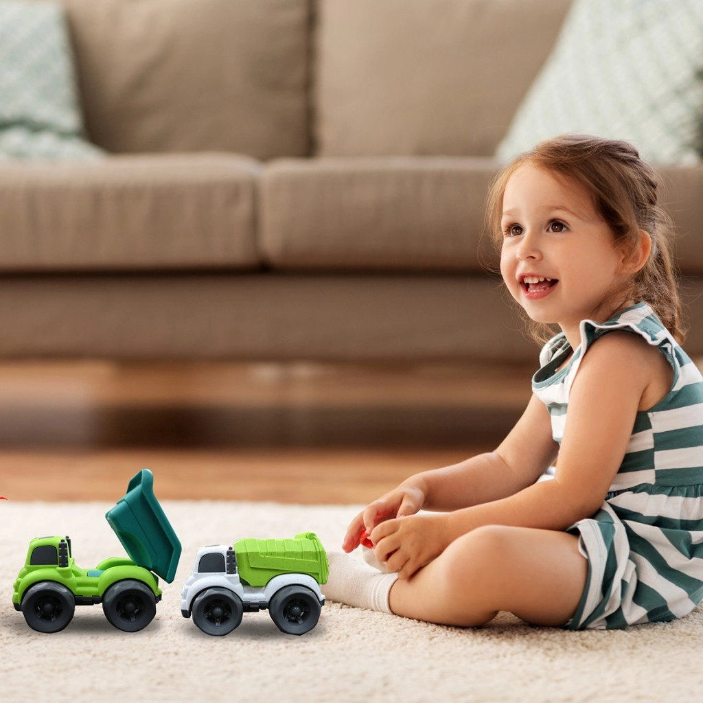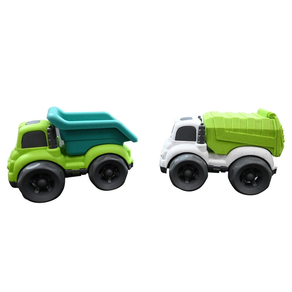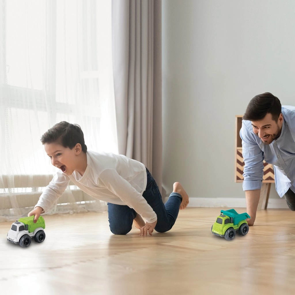 Ta okolju prijazen komplet vključuje dve trpežni tovorni vozili v privlačnih barvah – eno z zeleno–turkiznim kesonom in drugo z belim podvozjem ter izrazito zelenim tovornih prostorom. Zaradi velikih koles se gladko vozita po tleh in sta enostavna za upravljanje tudi z najmlajšimi ročicami. Funkcionalna nagibna tovornjača podpira igro vlog, gradnjo, prevoz »tovora« in naravni razvoj otroške domišljije.