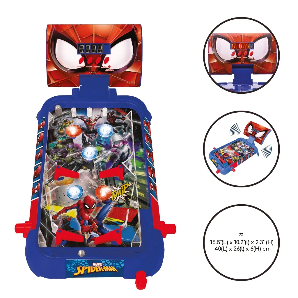 Uživajte v akcijskem pinballu s herojem SPIDER-MAN v praktičnem namiznem formatu. Modro ohišje z rdečimi kontrolnimi elementi, privlačna grafika in pregleden digitalni zaslon v slogu Spideyjevih oči zagotavljajo zabavo za otroke in celotno družino. Prozoren pokrov ščiti igralno površino in hkrati omogoča spremljanje vsakega zadetka in odboja žogice.