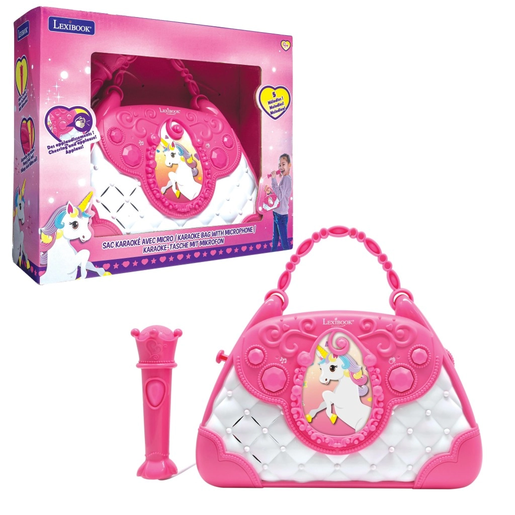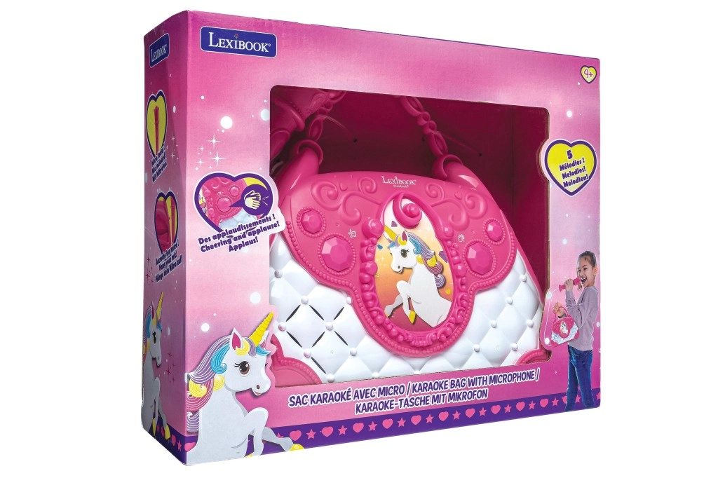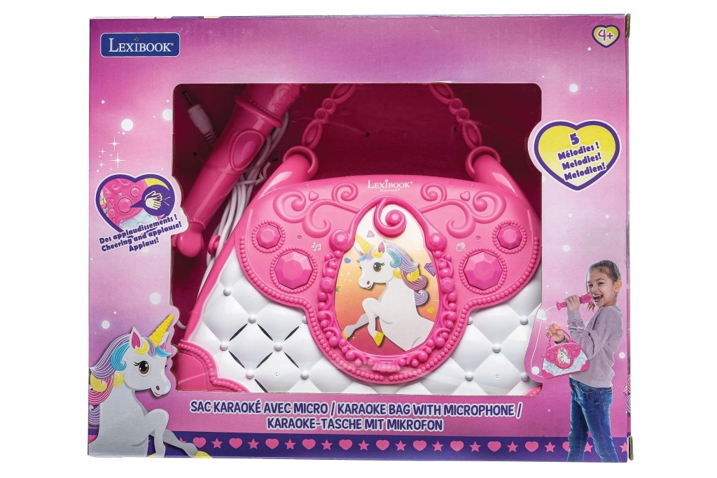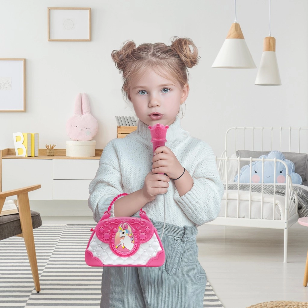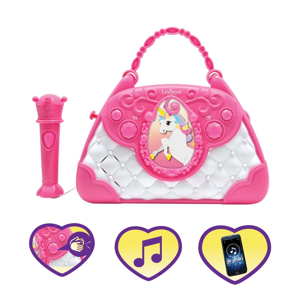 Stilska rožnato-bela torbica z motivom Samoroga spremeni vsak dan v mali oder. Otroci lahko pojejo v mikrofon in poslušajo svoj glas preko zmogljivega vgrajenega zvočnika. Z intuitivnimi gumbi zlahka nastavijo glasnost, izberejo melodije in aktivirajo aplavz, ki krepi njihovo samozavest.