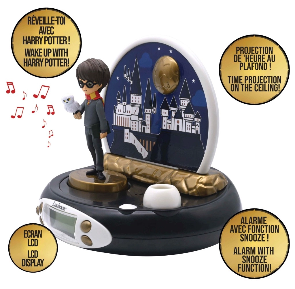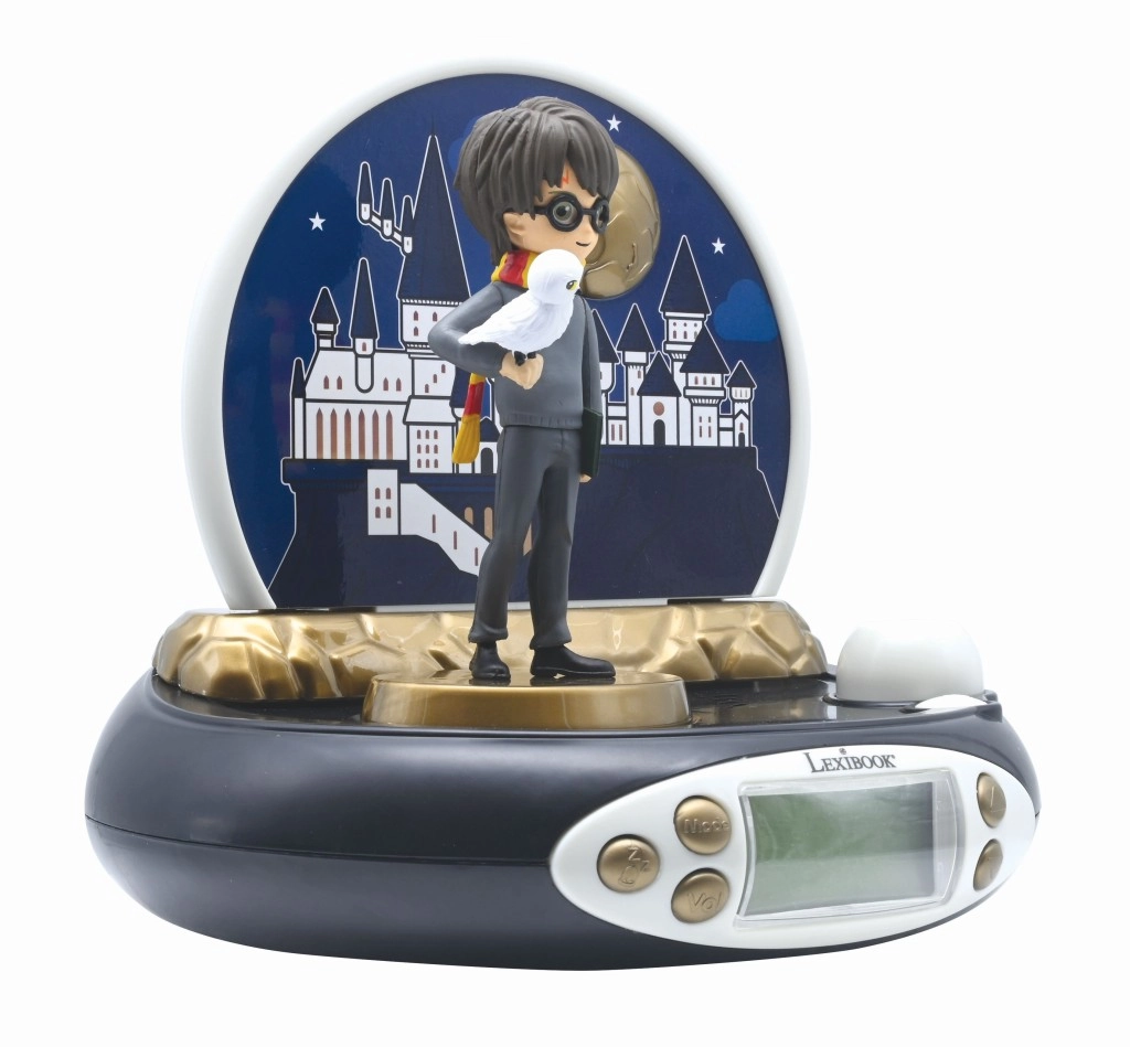 Stilska otroška budilka z motivom HARRY POTTER projicira čas na strop, ima pregleden LCD-zaslon, funkcijo dremeža in zvočne učinke. Dekorativni figurici Harryja in sove Hedvige z ozadjem Bradavičarke polepšata vsako nočno omarico in polepšata prebujanje malim in velikim oboževalcem.