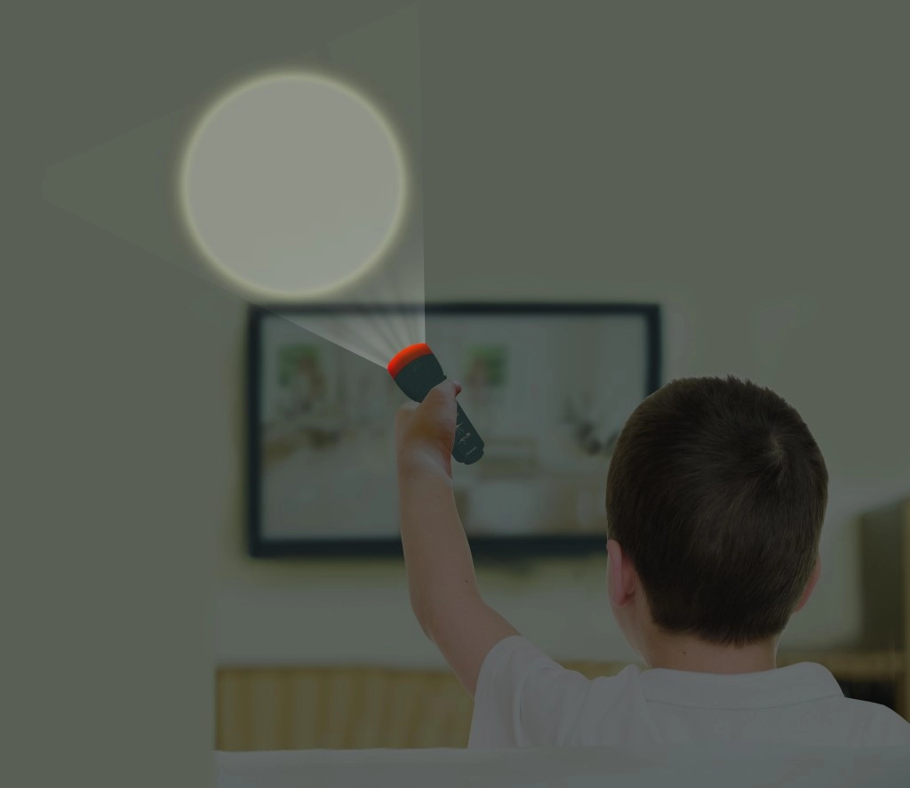 Kompaktna svetilka z izrazitim svetlobnim stožcem in oranžnim upravljalnim obročem pomaga otrokom varno raziskovati tudi pri zmanjšani vidljivosti.