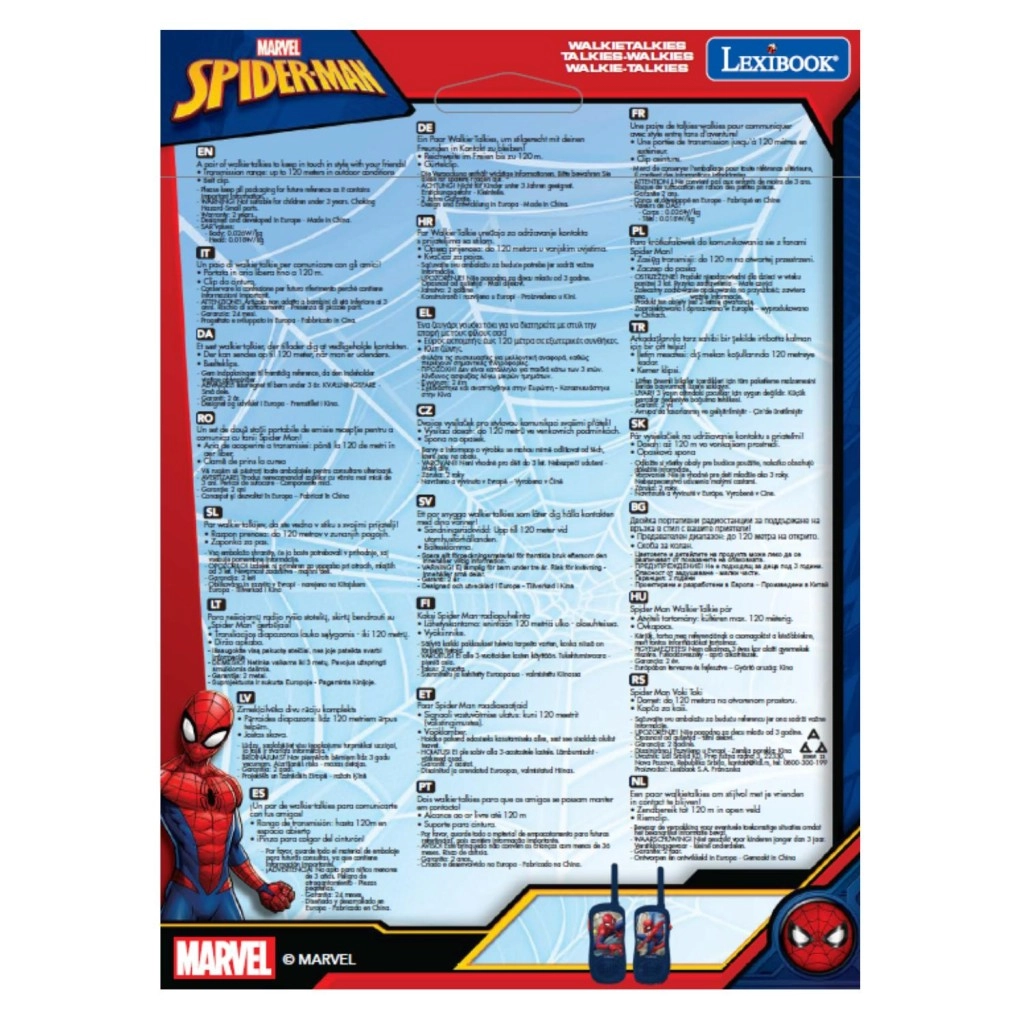 Razvijte otroško domišljijo z walkie-talkiji LEXIBOOK SPIDER-MAN. Temno modra izvedba z izrazito grafiko priljubljenega junaka pritegne na prvi pogled, medtem ko preprosto upravljanje in dolga antena zagotavljata jasno komunikacijo na razdalji do 120 metrov. Lahka, ergonomska zasnova se odlično prilega majhnim rokam, z praktično sponko pa jo je mogoče zlahka pripeti na pas.
