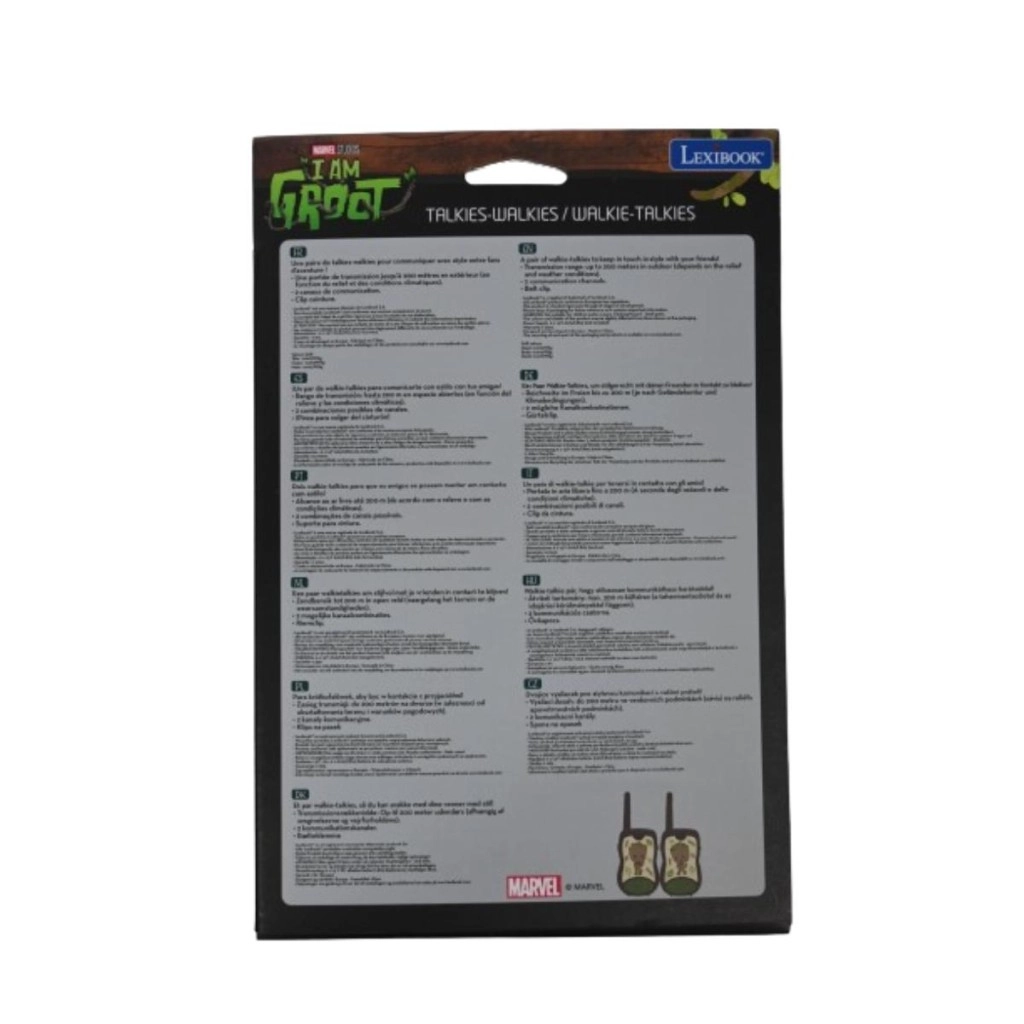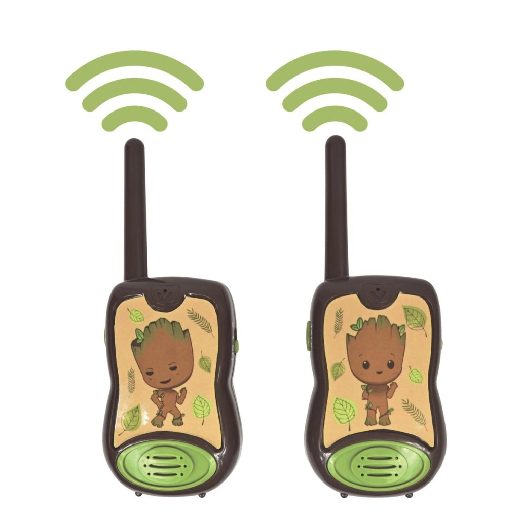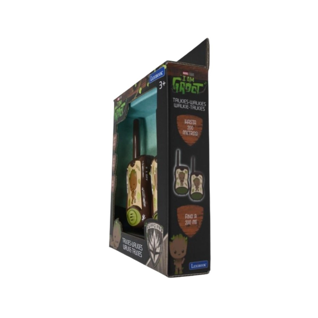 Zabavna in varna komunikacija za male pustolovce – otroški radijski sprejemniki LEXIBOOK Groot z motivom lika GROOT iz vesolja MARVEL ponujajo doseg do 200 m, preprosto upravljanje in trpežno zasnovo. Ergonomska oblika za majhne roke, izrazit gumb TALK in preklopnik kanala zagotavljajo, da bo komunikacija enostavna, igra pa polna domišljije.