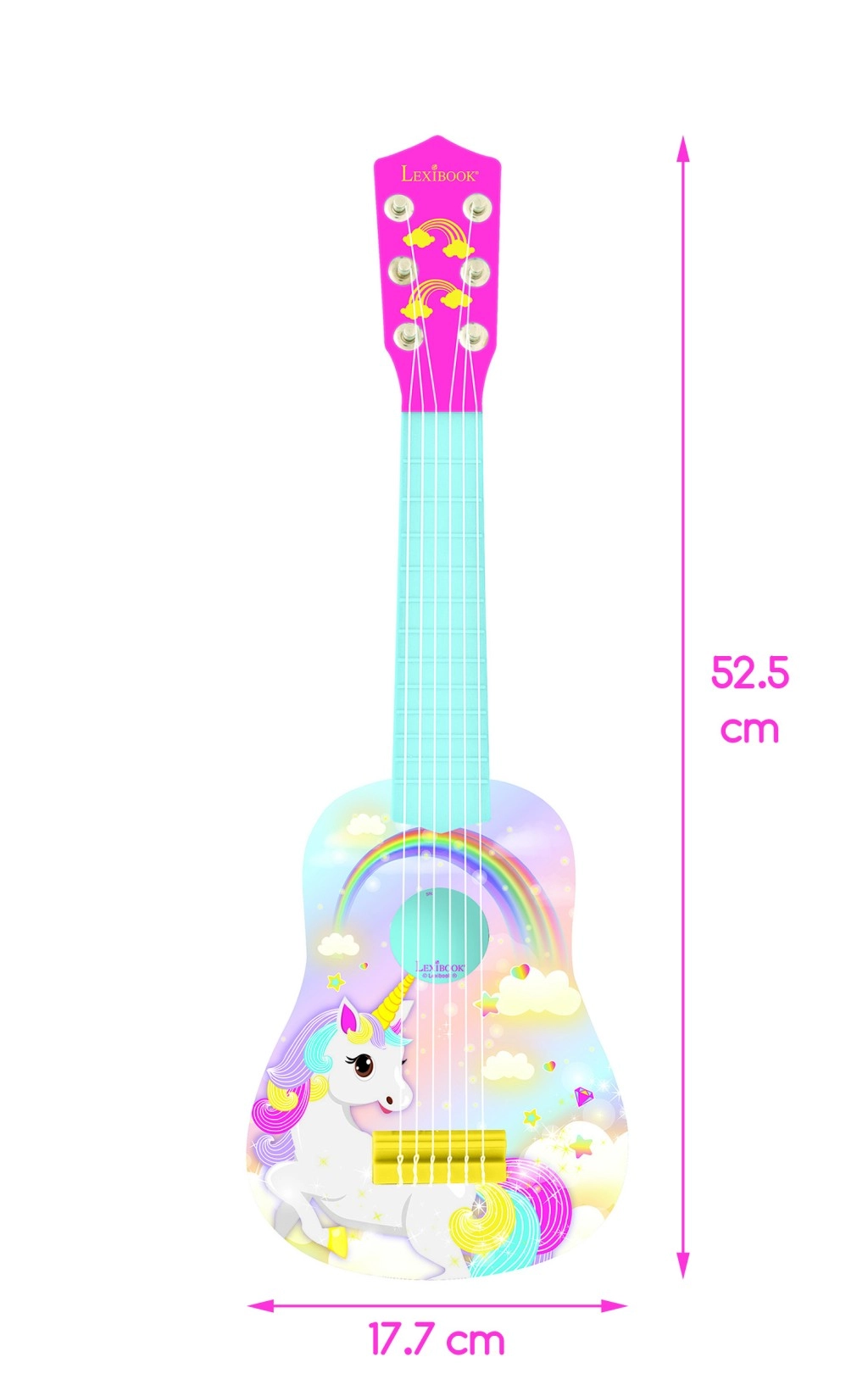 Moja prva kitara LEXIBOOK Samorog je odlična izbira za uvod otrok v svet glasbe. Zaradi kompaktnih mer 53 cm (21") dobro leži v otroških rokah, je lahka in enostavna za prenašanje. Pastelni dizajn s samorogom spodbuja domišljijo in vsakodnevno igranje spremeni v zabavno dejavnost.