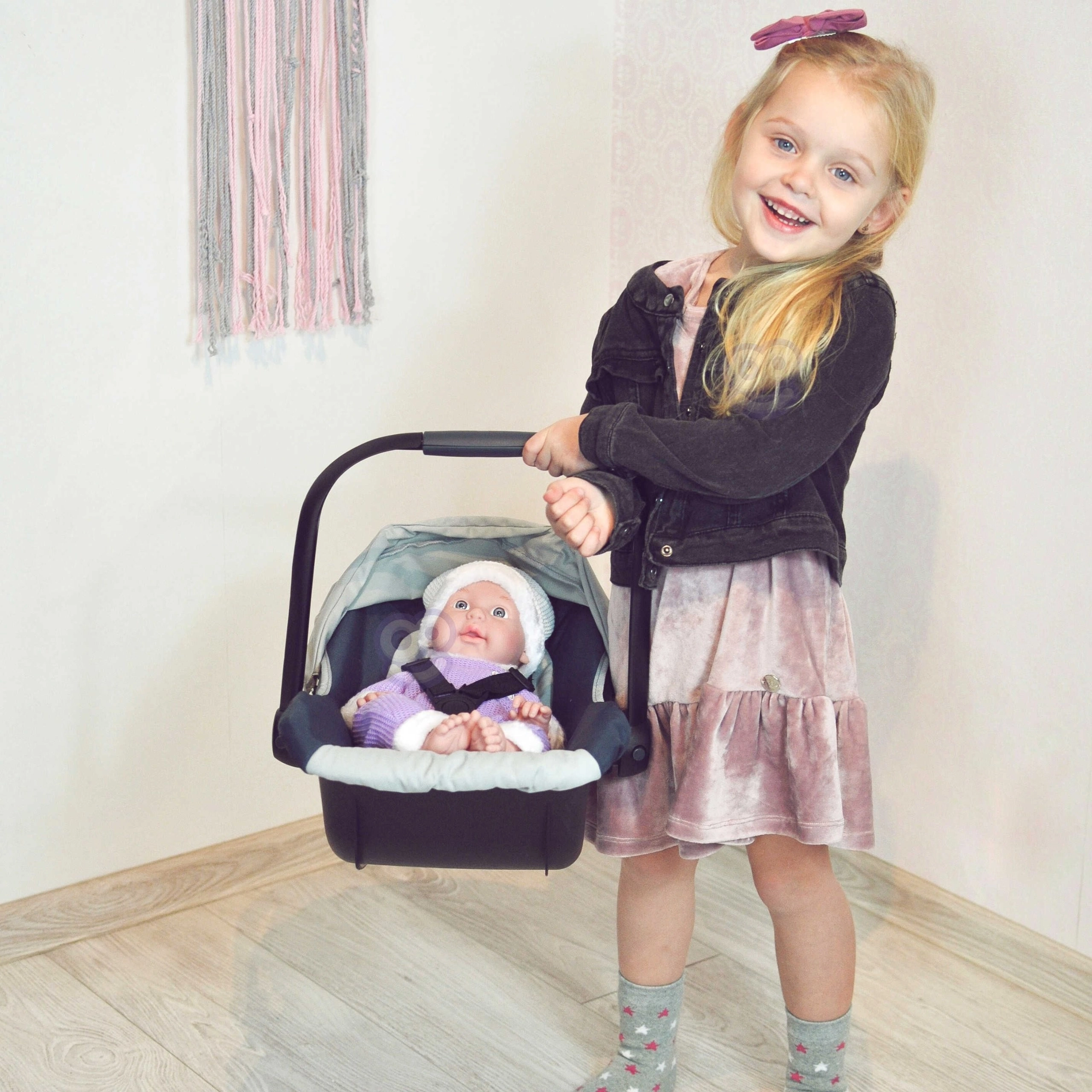 Nosilnica je zasnovana za punčke velikosti 33–48 cm in je opremljena s tritočkovnim pasom za zanesljivo pritrditev. Nastavljiv ročaj omogoča otrokom, da prilagodijo oprijem in punčko zlahka prenašajo. Prevleko je mogoče sneti in oprati, zato igra vedno ostane čista.