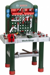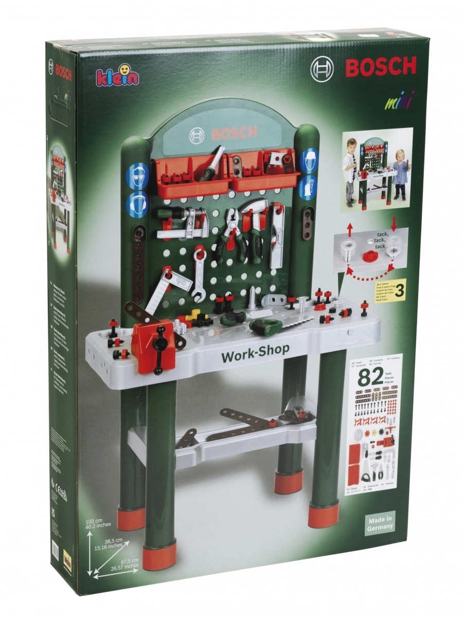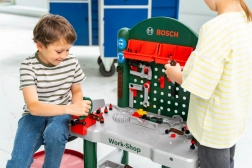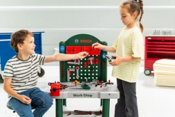 Licencirana otroška delavnica BOSCH z 82 deli ponuja realistično igro in učenje: robustna delovna miza s primežem, perforirano steno in 3 shranjevalnimi škatlami za pregledno organizacijo orodja. Izdelano v Nemčiji za dolgo življenjsko dobo in varno zabavo.