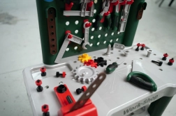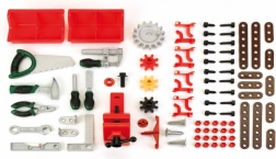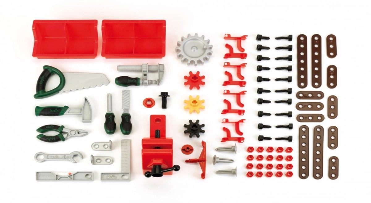 Popolna oprema, vključno z izvijači, ključem, libelo, kleščami, pilnikom, kladivom, žago, kotnikom, vijaki, maticami in konstrukcijskimi letvami. Otroci imajo vse potrebno za prve projekte in učenje skozi igro.