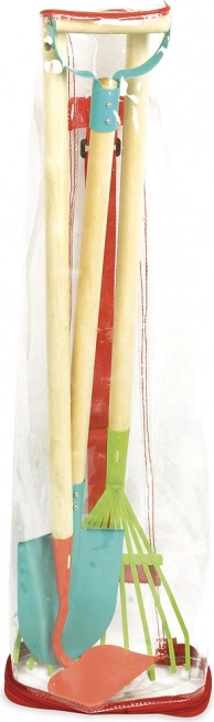 V pakiranju najdete vse potrebno: lopato za kopanje in presajanje, grablje za pospravljanje listja in izravnavo prsti, motiko za rahljanje in pletje ter tudi zaščitne rokavice s prožnim robom za udobno nošenje. Idealno za otroke od 3 let.