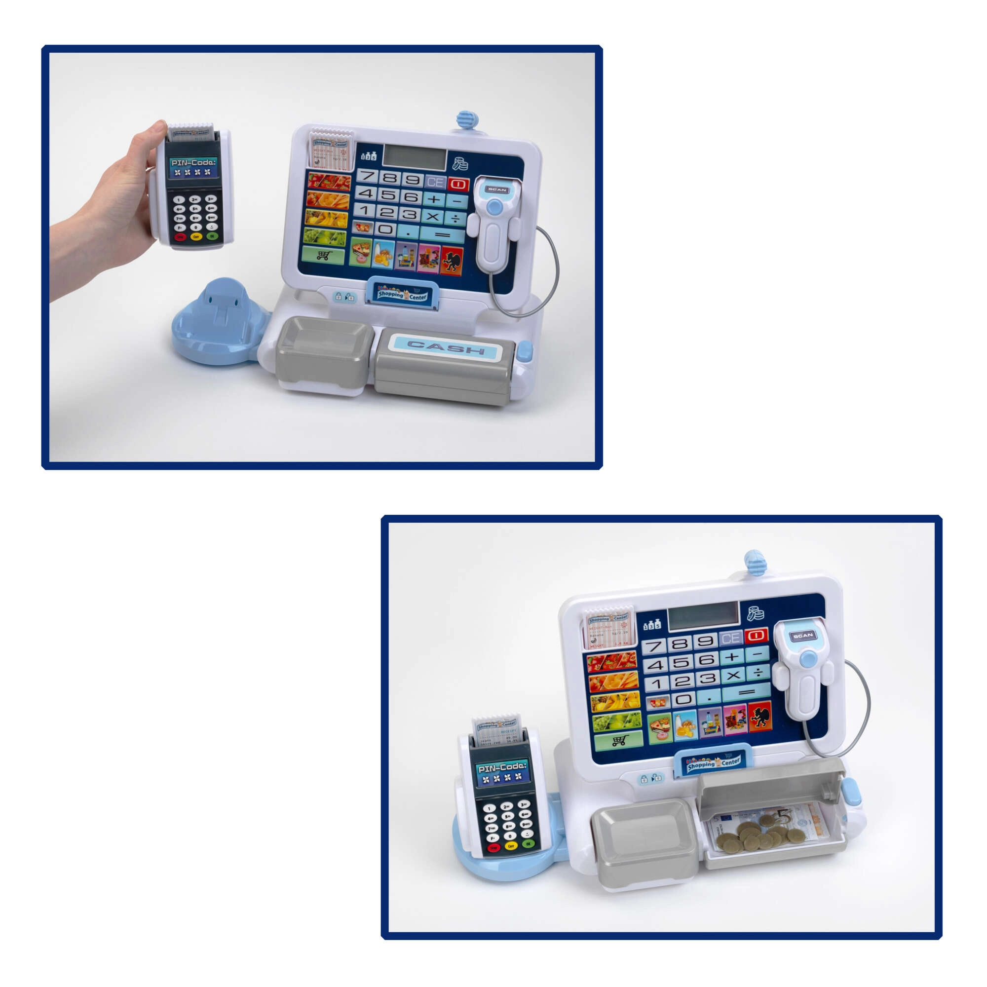 Elektronska blagajna za otroke posnema pravo blagajno: ima pregleden zaslon s kalkulatorjem, čitalnik kartic, skener in nagibni predal za gotovino z znanim »klikom«. Otroci lahko »skenirajo« izdelke, vnesejo cene in pustijo blagajni, da vse samodejno sešteje. Sivo-bela barvna izvedba deluje moderno in čisto.